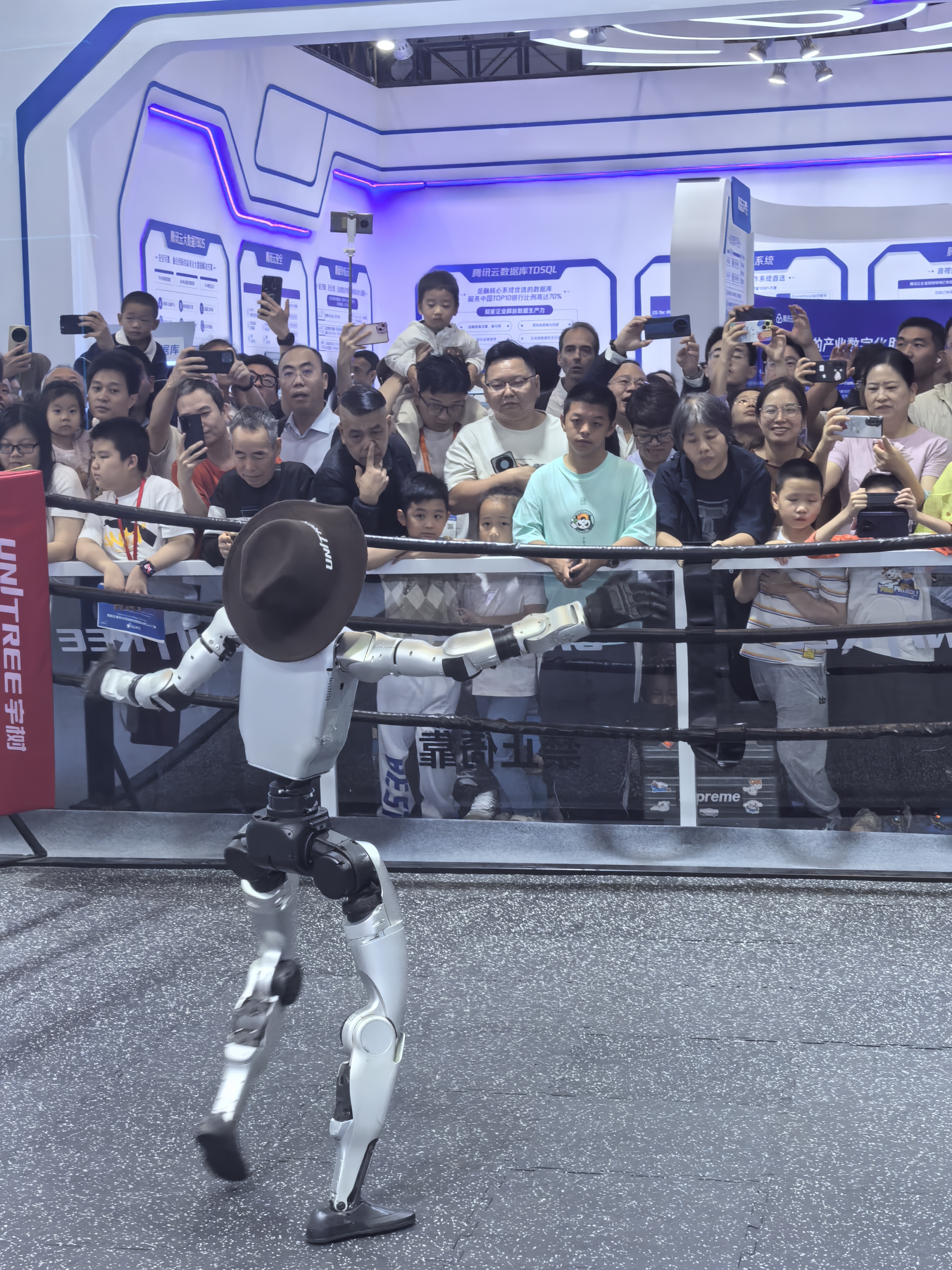 即使開(kāi)展最后一天,機(jī)器人展區(qū)仍舊人頭攢動(dòng),熱度絲毫不減。在宇樹(shù)科技股份有限公司(以下簡(jiǎn)稱(chēng)“宇樹(shù)”)展區(qū),機(jī)器人格斗比賽開(kāi)賽前半小時(shí),游客已將展位圍得水泄不通。小朋友則聚集在上海傅利葉智能科技股份有限公司(以下簡(jiǎn)稱(chēng)“傅利葉”)展區(qū),與機(jī)器人比拼“井字棋”,一旁深圳市眾擎機(jī)器人科技有限公司等企業(yè)的“機(jī)器人軍團(tuán)”巡游,展現(xiàn)出穩(wěn)健的運(yùn)動(dòng)和應(yīng)變能力。