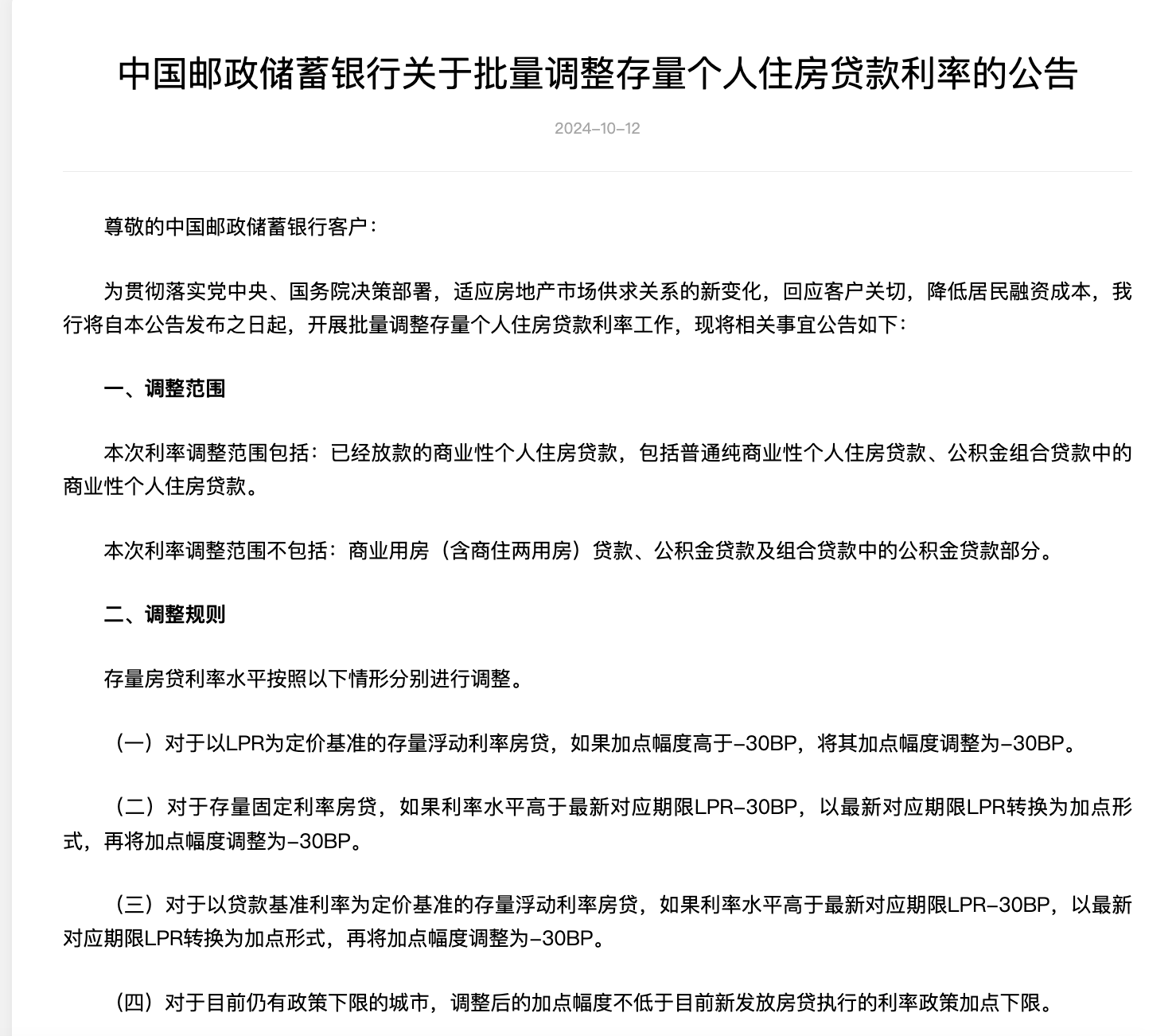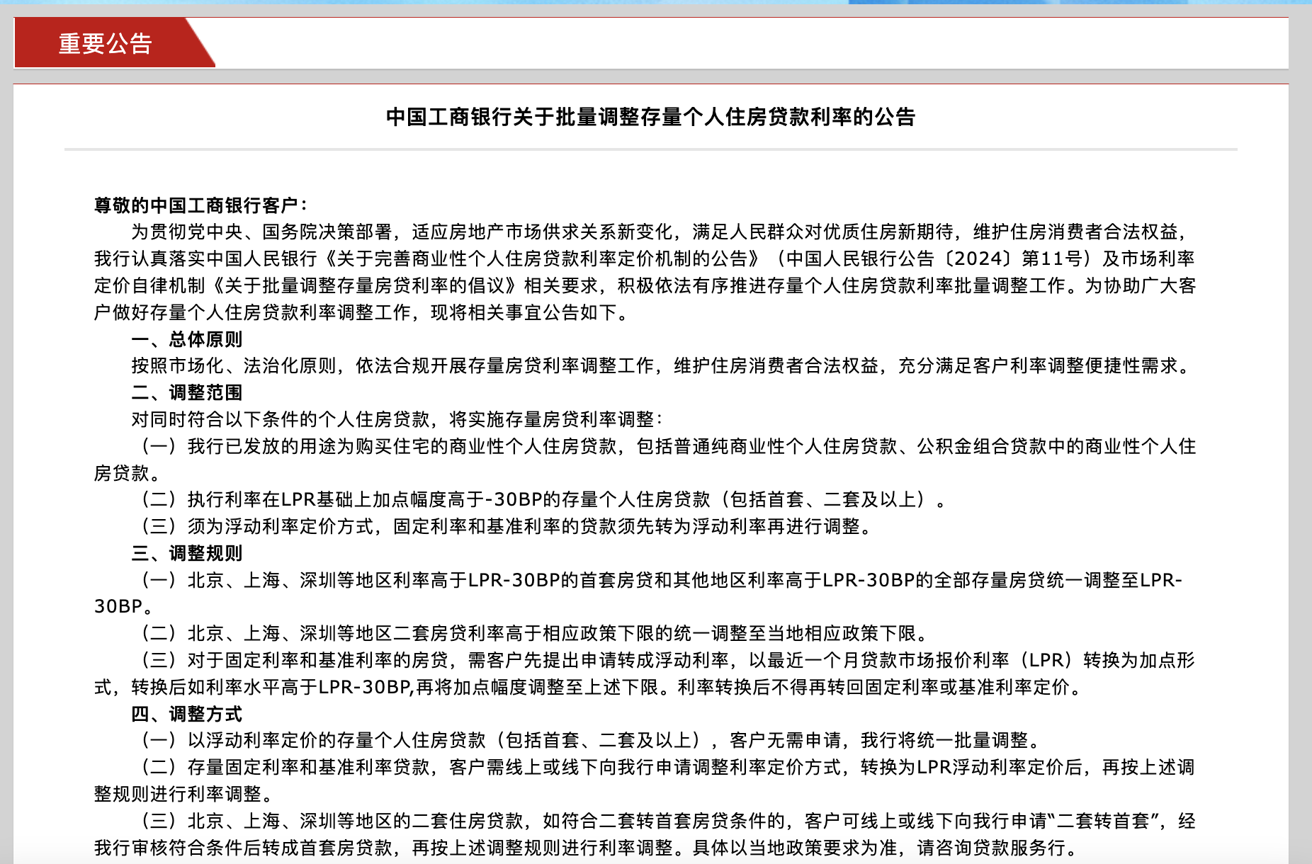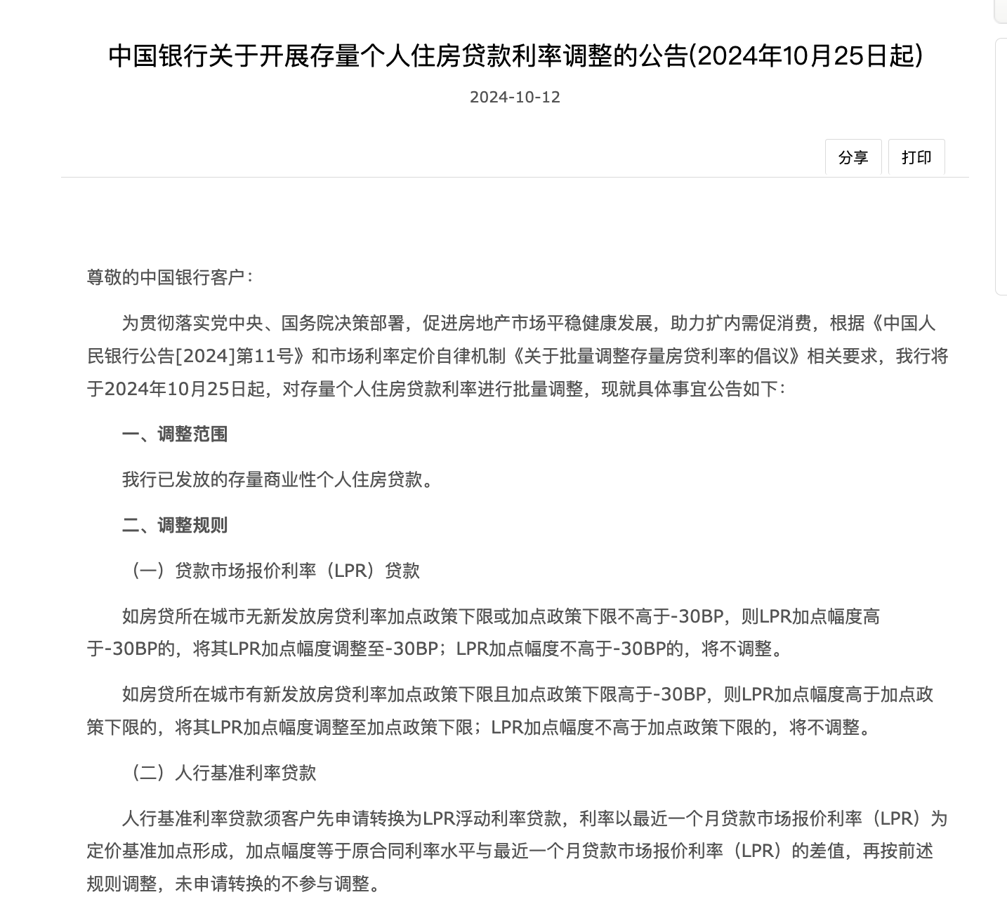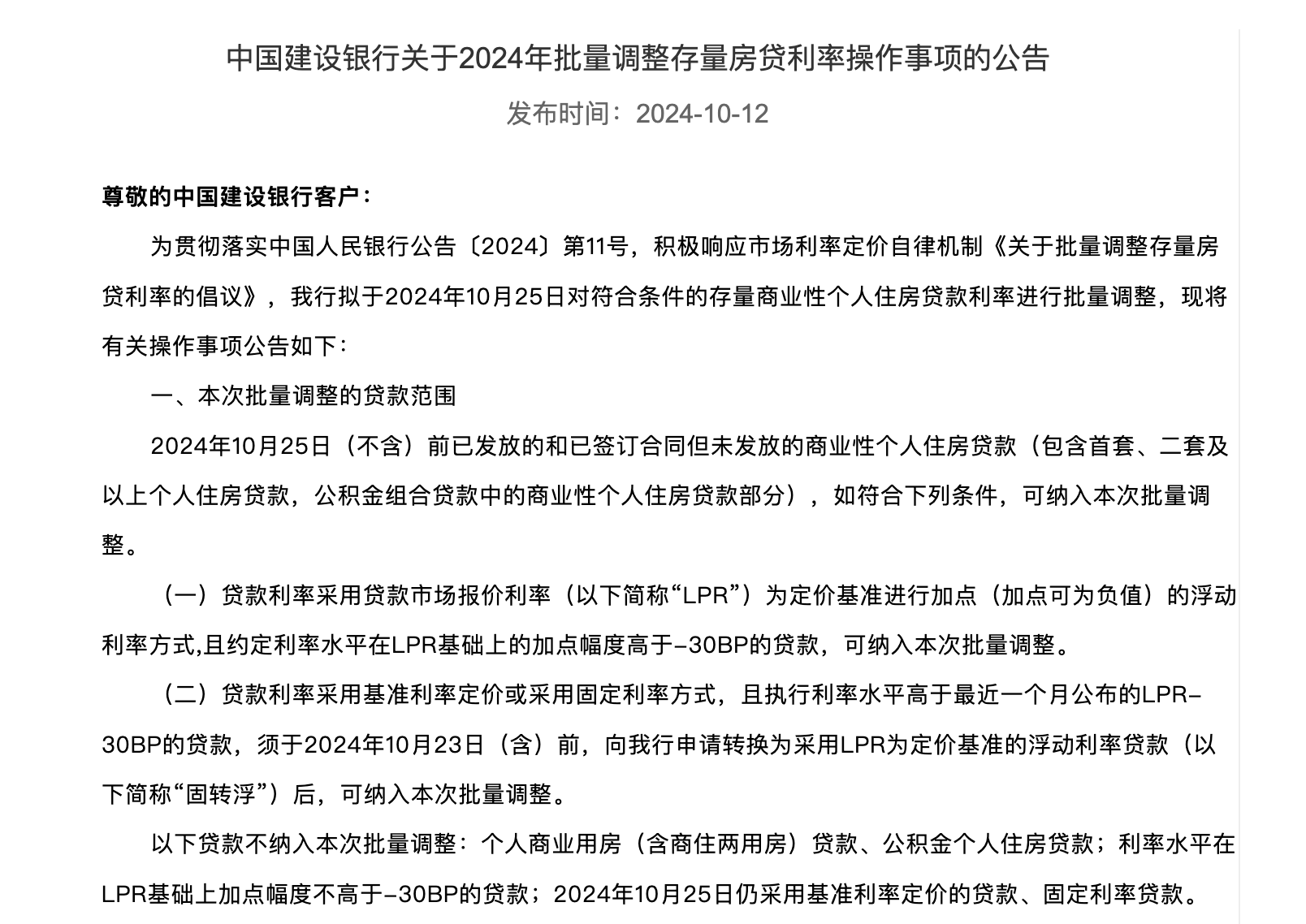 有銀行宣布:10月25日完成全部存量房貸利率批量調(diào)整!2024-10-10 17:45