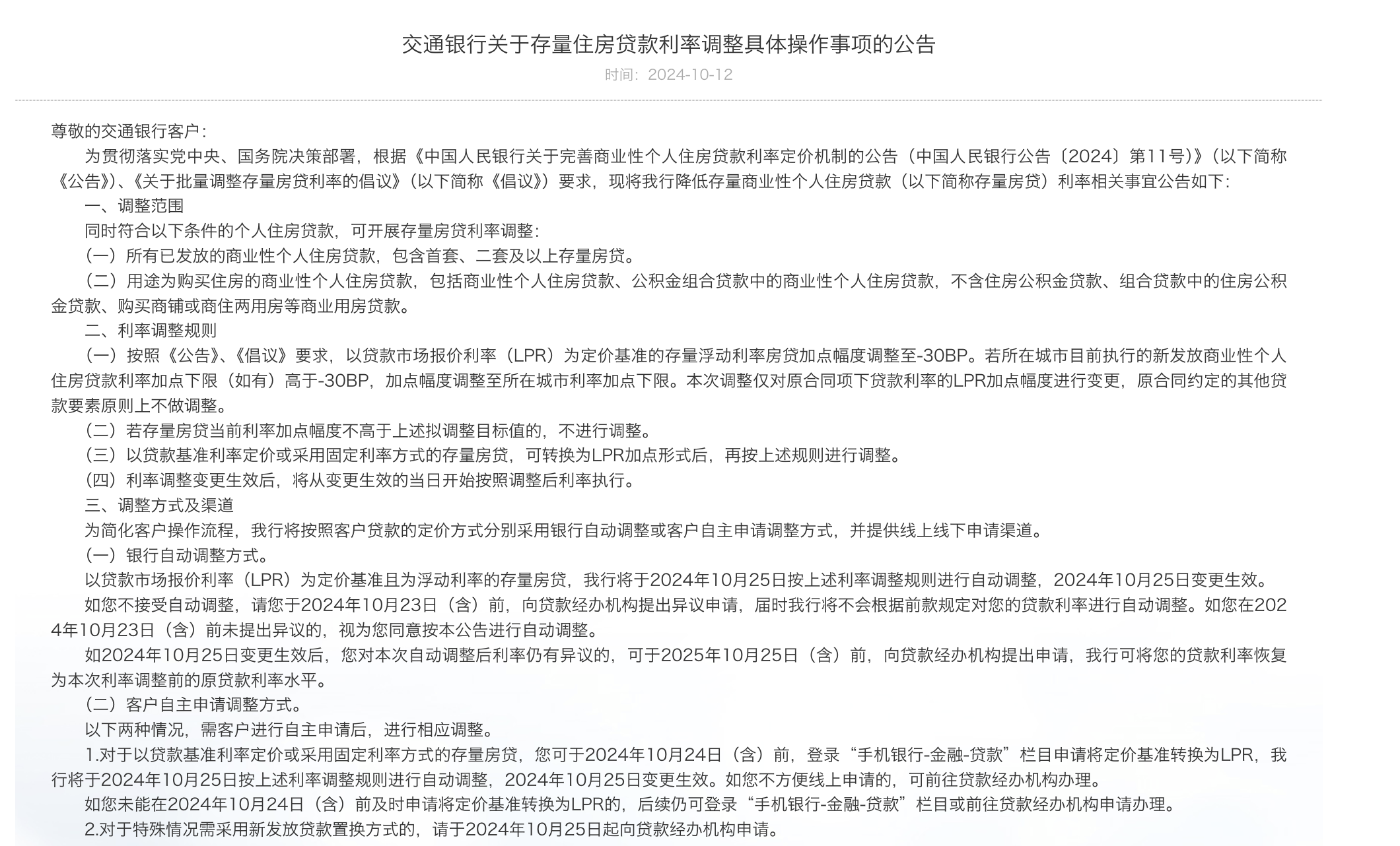 銀行自動(dòng)調(diào)整方式,即,對(duì)于符合條件的存量個(gè)人住房貸款,上述銀行將于2024年10月25日集中批量調(diào)整合同貸款利率。
