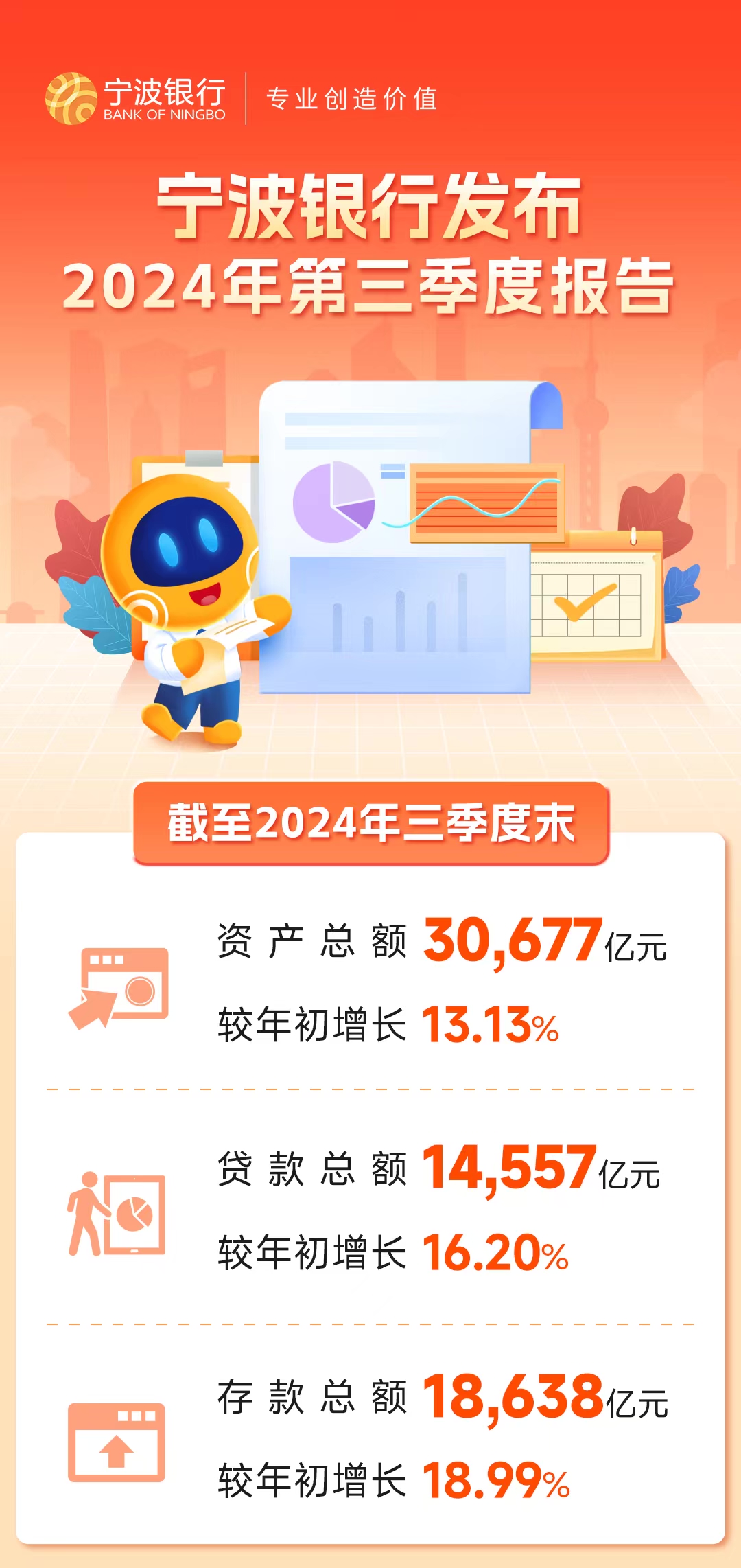 通過“專業(yè)化、數(shù)字化、平臺化、國際化”持續(xù)創(chuàng)新經(jīng)營,2024年前三季度,寧波銀行資產(chǎn)規(guī)模保持穩(wěn)步增長。三季報數(shù)據(jù)顯示,截至2024年9月末,寧波銀行資產(chǎn)總額30,676.66億元,較年初增長13.13%;貸款及墊款總額14,557.05億元,較年初增長16.20%;存款總額18,637.59億元,較年初增長18.99%。