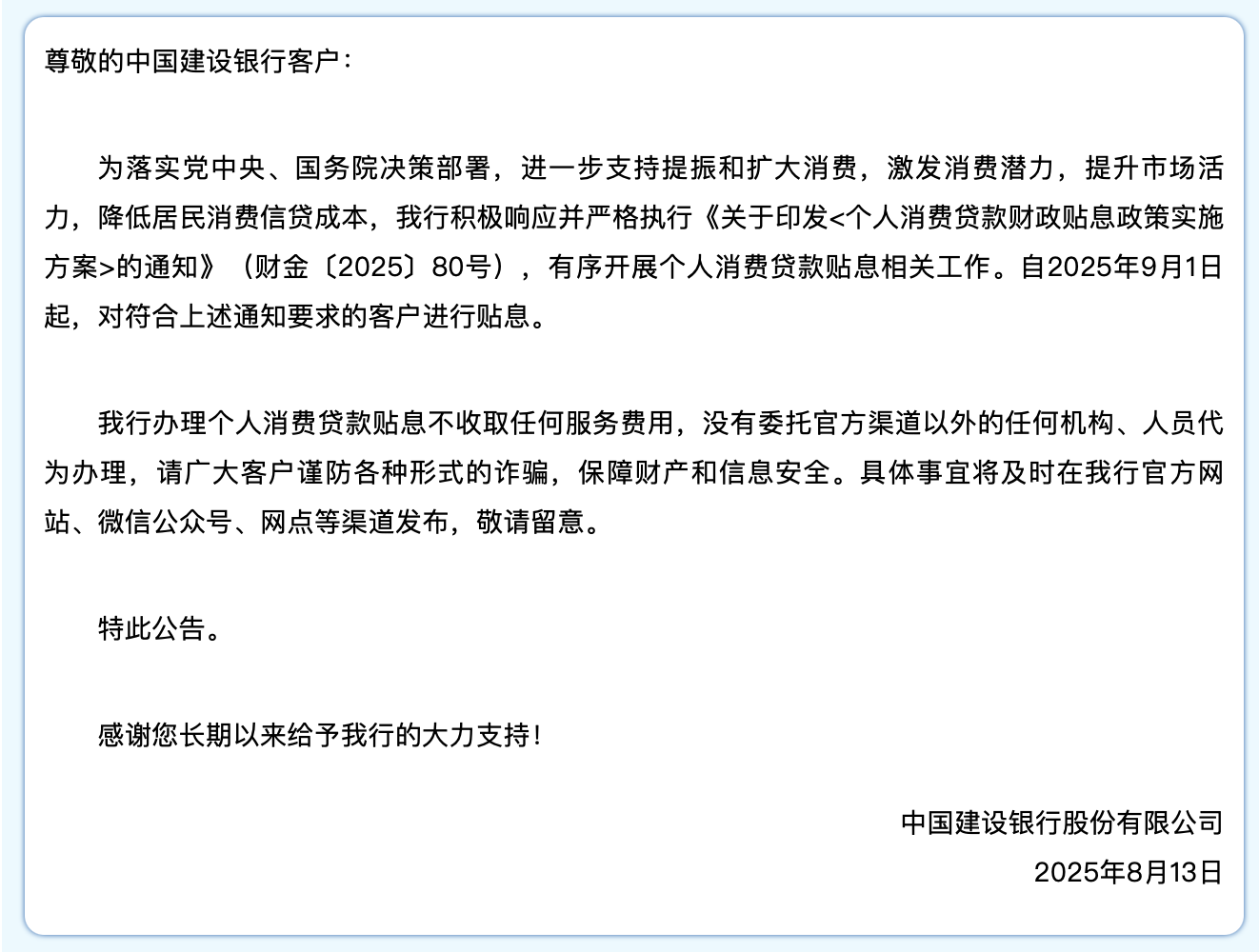 建設(shè)銀行公告提到,為落實黨中央、國務(wù)院決策部署,進一步支持提振和擴大消費,激發(fā)消費潛力,提升市場活力,降低居民消費信貸成本,我行積極響應(yīng)并嚴格執(zhí)行《實施方案》,有序開展個人消費貸款貼息相關(guān)工作。自2025年9月1日起,對符合上述通知要求的客戶進行貼息。
