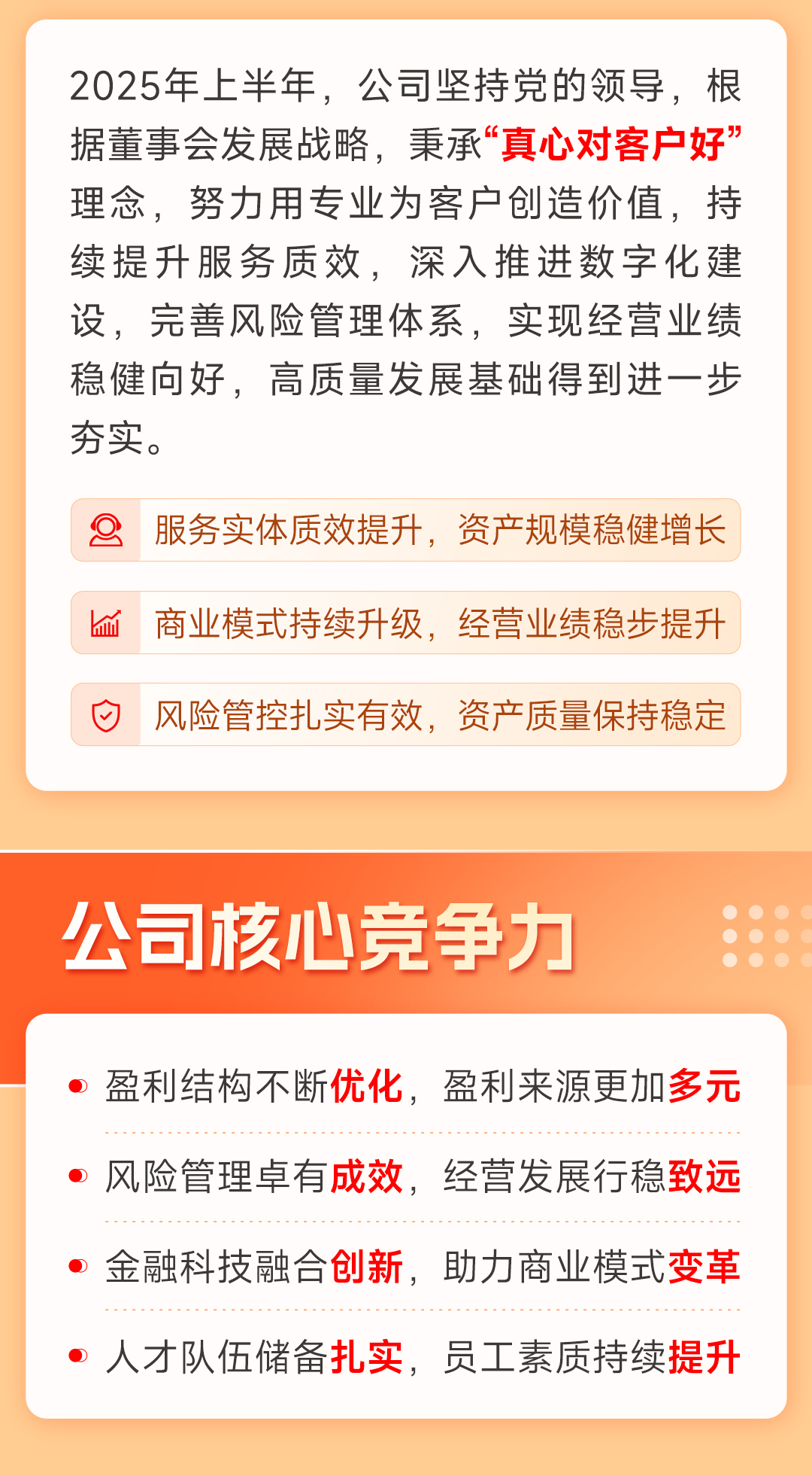 2025年上半年,面對行業(yè)息差收窄、盈利承壓的挑戰(zhàn),寧波銀行始終堅持黨的領導,根據(jù)董事會制定的發(fā)展戰(zhàn)略,堅持實施差異化經營策略,秉承“真心對客戶好”的理念,努力用專業(yè)為客戶創(chuàng)造價值,持續(xù)提升服務質效,深入推進數(shù)字化建設,完善風險管理體系,經營業(yè)績穩(wěn)健向好,高質量發(fā)展基礎得到進一步夯實。