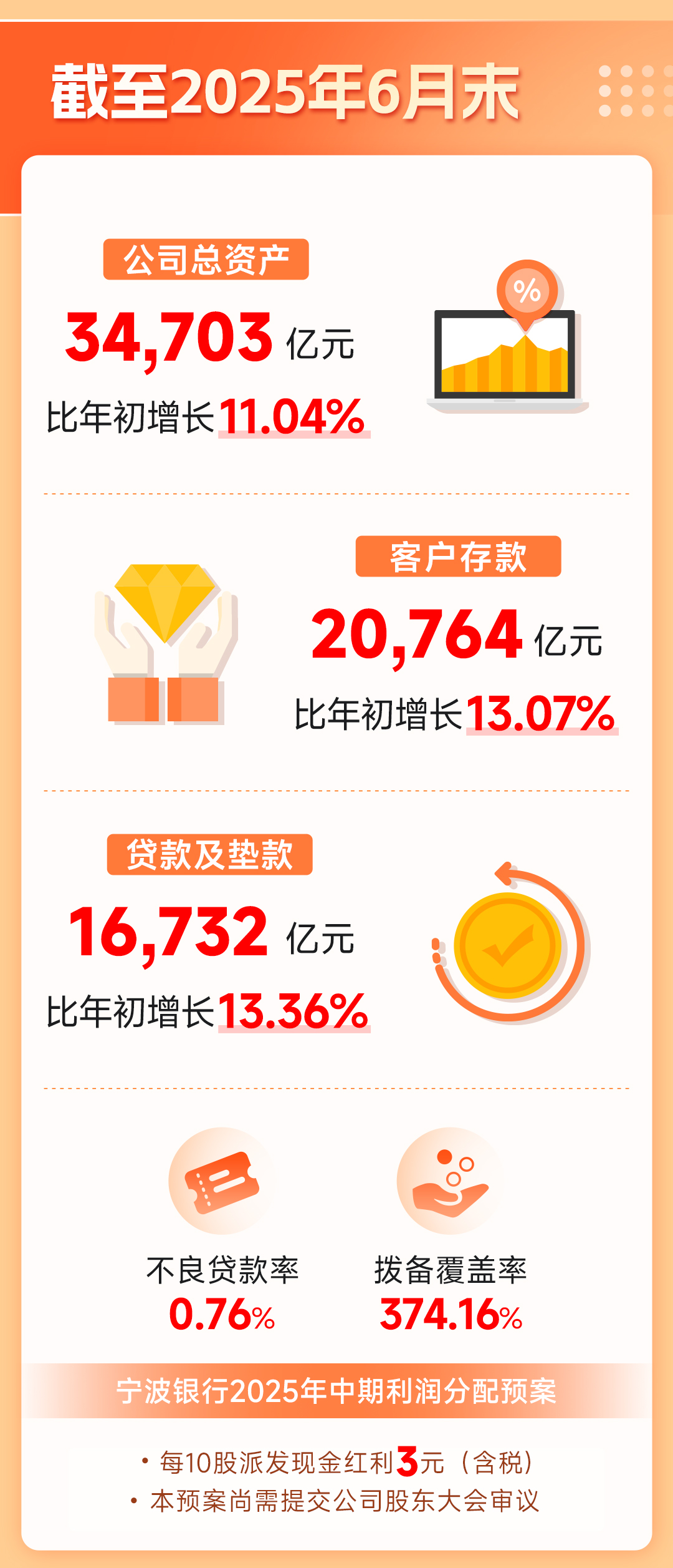 上半年,寧波銀行不斷升級的“專業(yè)化、數(shù)字化、綜合化、國際化”賦能體系繼續(xù)發(fā)揮成效,在助力更多實體經濟客戶實現(xiàn)更高質量發(fā)展的同時,寧波銀行自身的市場競爭力也持續(xù)增強。截至2025年6月末,寧波銀行資產總額34,703.32億元,比年初增長11.04%;存款總額20,764.14億元,比年初增長13.07%;貸款及墊款總額16,732.13億元,比年初增長13.36%。