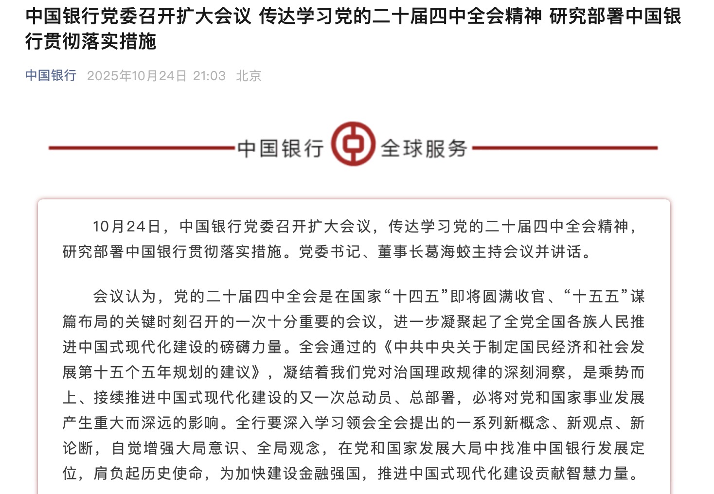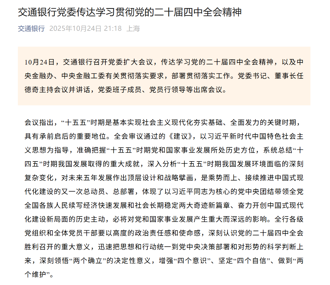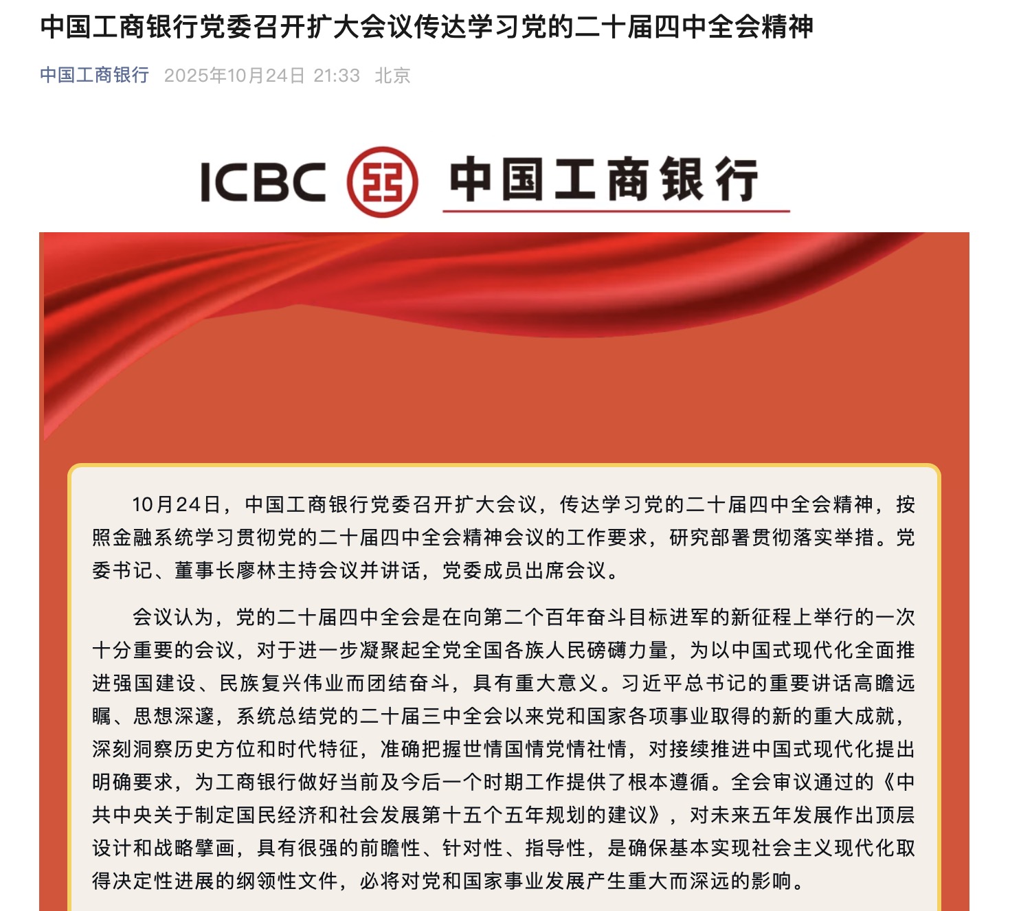 10月24日,工商銀行、農(nóng)業(yè)銀行、中國銀行、建設銀行、交通銀行、郵儲銀行黨委紛紛召開會議傳達學習黨的二十屆四中全會精神,按照金融系統(tǒng)學習貫徹黨的二十屆四中全會精神會議的工作要求,研究部署貫徹落實舉措。