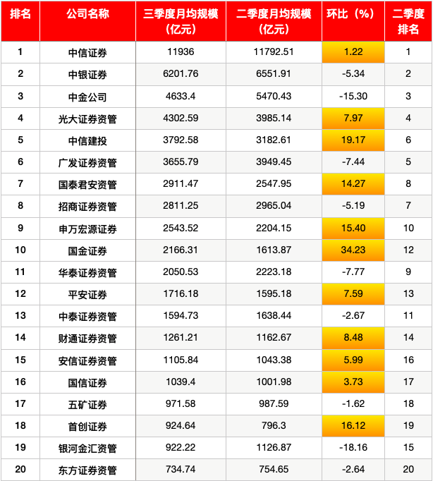 環(huán)比方面,國(guó)金證券三季度月均規(guī)模環(huán)比大增34.23%,增速排名第一;中信建投緊隨其后,環(huán)比增長(zhǎng)19.17%;此外,首創(chuàng)證券、申萬(wàn)宏源證券、國(guó)泰君安資管等3家的環(huán)比增幅也均超過(guò)10%。也有9家券商月均資管規(guī)模出現(xiàn)不同程度的減少,其中有2家環(huán)比降幅均超10%。