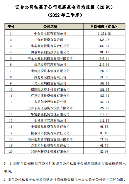 同時(shí),三季度,證券公司私募子公司私募基金月均規(guī)模前20強(qiáng)也出爐。中金資本持續(xù)以1374.98億元的月均規(guī)模遙遙領(lǐng)先;金石投資與華泰紫金投資之間競(jìng)爭(zhēng)較大,三季度,金石投資超越華泰紫金投資位列第二,月均規(guī)模為435.25億元;華泰紫金投資為432.67億元。