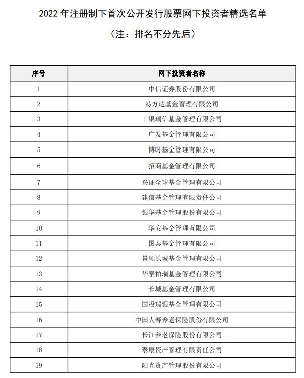 據(jù)悉,根據(jù)《證券發(fā)行與承銷(xiāo)管理辦法》《注冊(cè)制下首次公開(kāi)發(fā)行股票網(wǎng)下投資者分類(lèi)評(píng)價(jià)和管理指引》的有關(guān)規(guī)定,中證協(xié)于2022年6月27日啟動(dòng)2022年注冊(cè)制下首次公開(kāi)發(fā)行股票網(wǎng)下投資者精選名單的申報(bào)工作。經(jīng)過(guò)公司自評(píng)、協(xié)會(huì)復(fù)核、征求意見(jiàn)和信息公示等程序,形成了2022年注冊(cè)制下首次公開(kāi)發(fā)行股票網(wǎng)下投資者精選名單。
