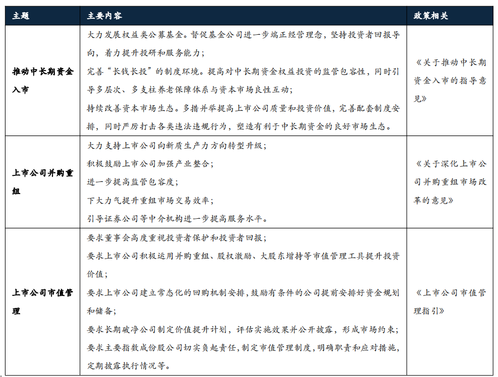 政策支持活躍并購重組、一級市場重現(xiàn)生機(jī)。(1)證監(jiān)會將用好股票、債券、期貨等多種資本市場工具,活躍并購重組市場,將發(fā)布關(guān)于促進(jìn)并購重組的六條措施。積極鼓勵上市公司加強(qiáng)產(chǎn)業(yè)整合,支持上市公司分期發(fā)行股份,提升重組市場交易效率。(2)金融監(jiān)管總局?jǐn)M擴(kuò)大銀行系金融資產(chǎn)投資公司股權(quán)投資試點范圍至18個城市,適當(dāng)放寬股權(quán)投資金額和限制。