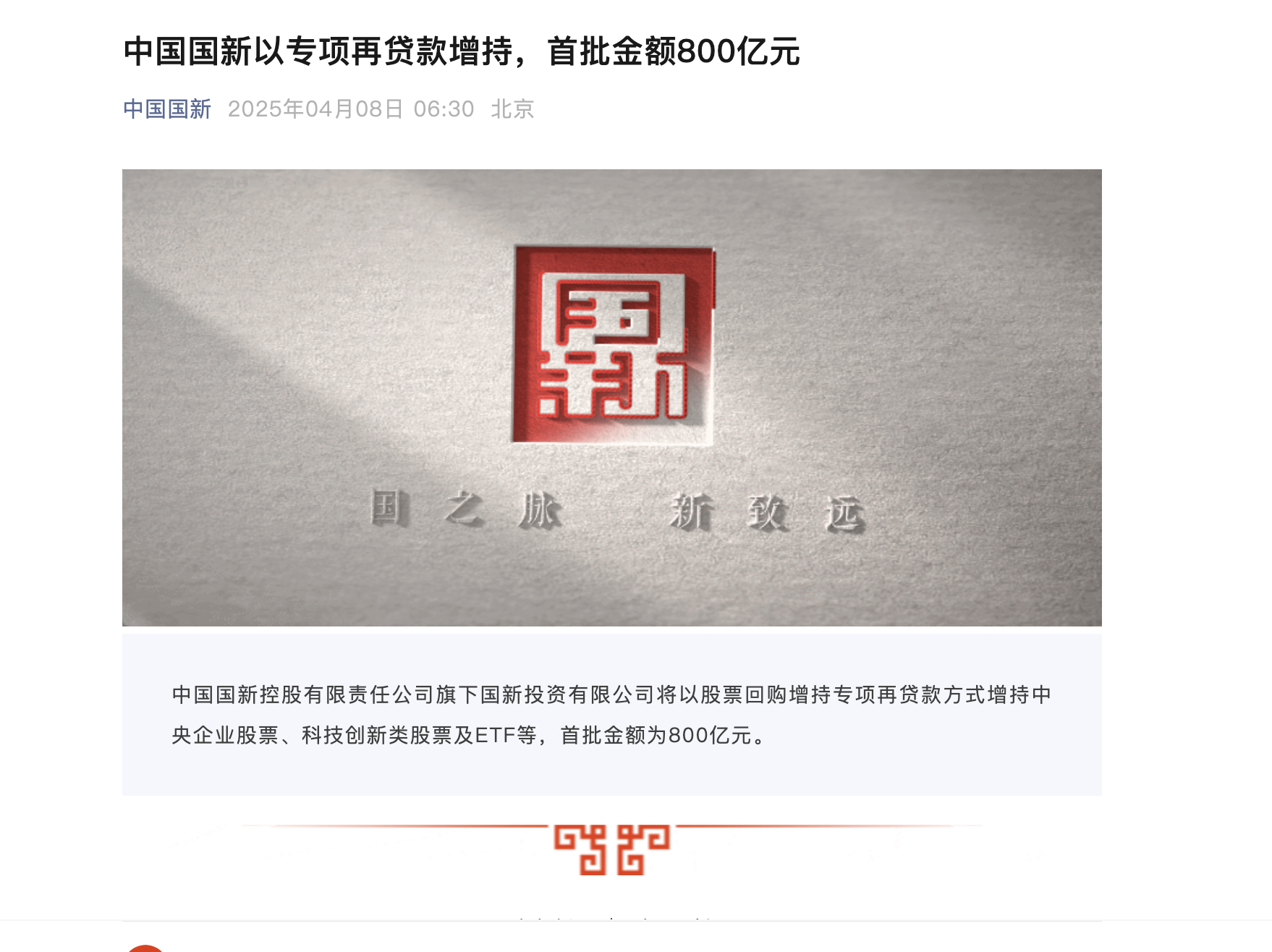 中國國新表示,旗下國新投資有限公司將以股票回購增持專項再貸款方式增持中央企業(yè)股票、科技創(chuàng)新類股票及ETF等,首批金額為800億元。
