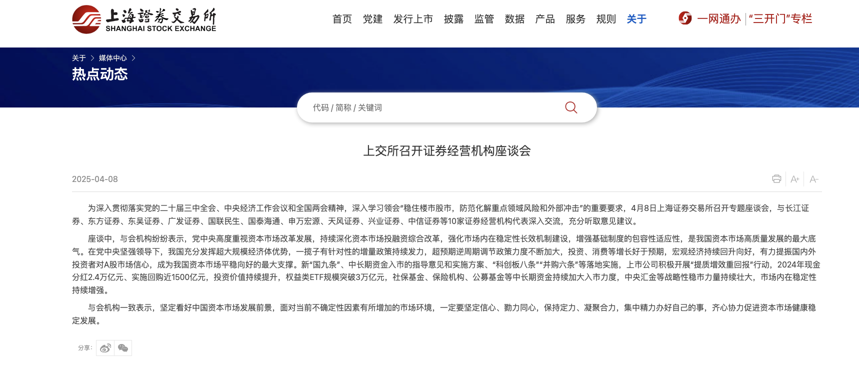 本報訊 (記者毛藝融)記者從上海證券交易所官網(wǎng)獲悉,為深入貫徹落實(shí)黨的二十屆三中全會、中央經(jīng)濟(jì)工作會議和全國兩會精神,深入學(xué)習(xí)領(lǐng)會“穩(wěn)住樓市股市,防范化解重點(diǎn)領(lǐng)域風(fēng)險和外部沖擊”的重要要求,4月8日上海證券交易所召開專題座談會,與長江證券、東方證券、東吳證券、廣發(fā)證券、國聯(lián)民生、國泰海通、申萬宏源、天風(fēng)證券、興業(yè)證券、中信證券等10家證券經(jīng)營機(jī)構(gòu)代表深入交流,充分聽取意見建議。