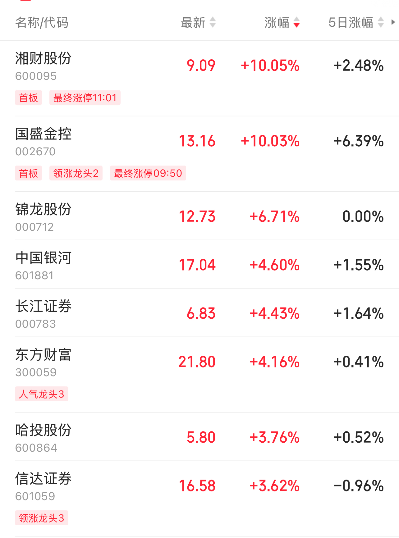 截至午間收盤,證券板塊整體漲幅達(dá)2.91%,成交額已突破350億元,達(dá)到近期高位,顯示出市場資金對券商板塊的積極關(guān)注與參與。具體來看,板塊內(nèi)個股全面上漲,其中,湘財股份、國盛金控表現(xiàn)最為亮眼,其股價在盤中觸及漲停板;錦龍股份的漲幅也較為可觀,超6%緊隨其后。