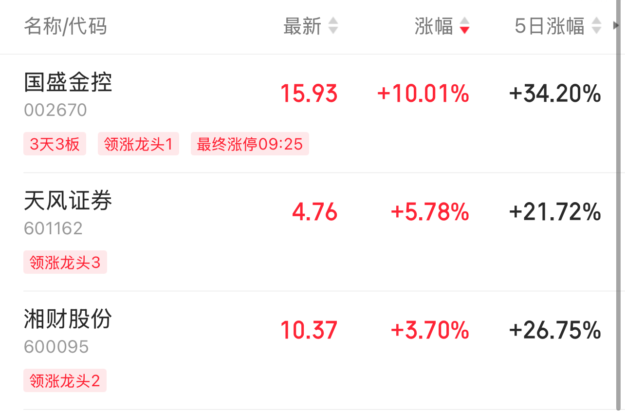 聚焦板塊內(nèi)個(gè)股表現(xiàn),分化態(tài)勢顯著。作為本輪行情的領(lǐng)漲龍頭,國盛金控今日開盤即“一字”漲停,連續(xù)第三個(gè)交易日實(shí)現(xiàn)漲停。拉長時(shí)間線看,該股近5個(gè)交易日累計(jì)漲幅高達(dá)34.2%,遠(yuǎn)超板塊平均水平。此外,天風(fēng)證券緊隨其后,昨日漲停后今日盤中持續(xù)活躍。