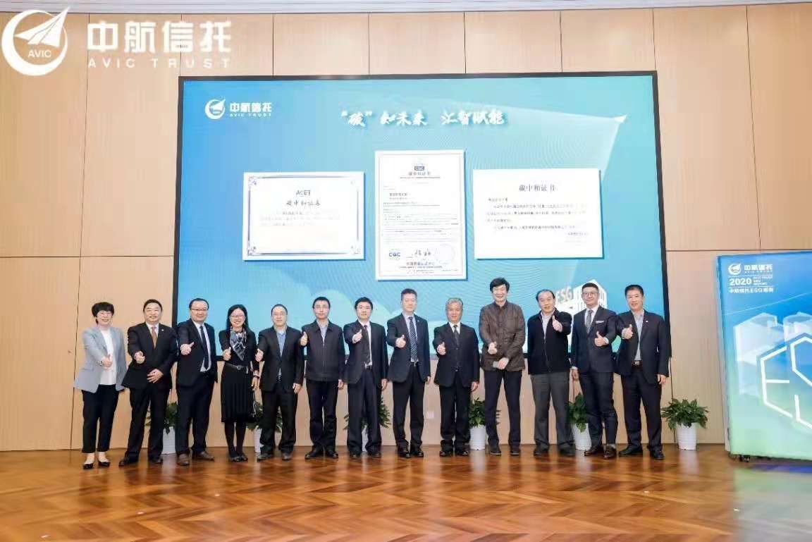 隨后,在現(xiàn)場(chǎng)及線(xiàn)上領(lǐng)導(dǎo)嘉賓的共同見(jiàn)證下,中航信托航信大廈碳中和證書(shū)發(fā)布儀式隆重舉行,中航信托黨委副書(shū)記、總經(jīng)理周祺接受了中國(guó)節(jié)能協(xié)會(huì)、中國(guó)質(zhì)量認(rèn)證中心、上海環(huán)境能源交易所三方分別頒發(fā)的《中航信托航信大廈2020年度碳中和證書(shū)》。