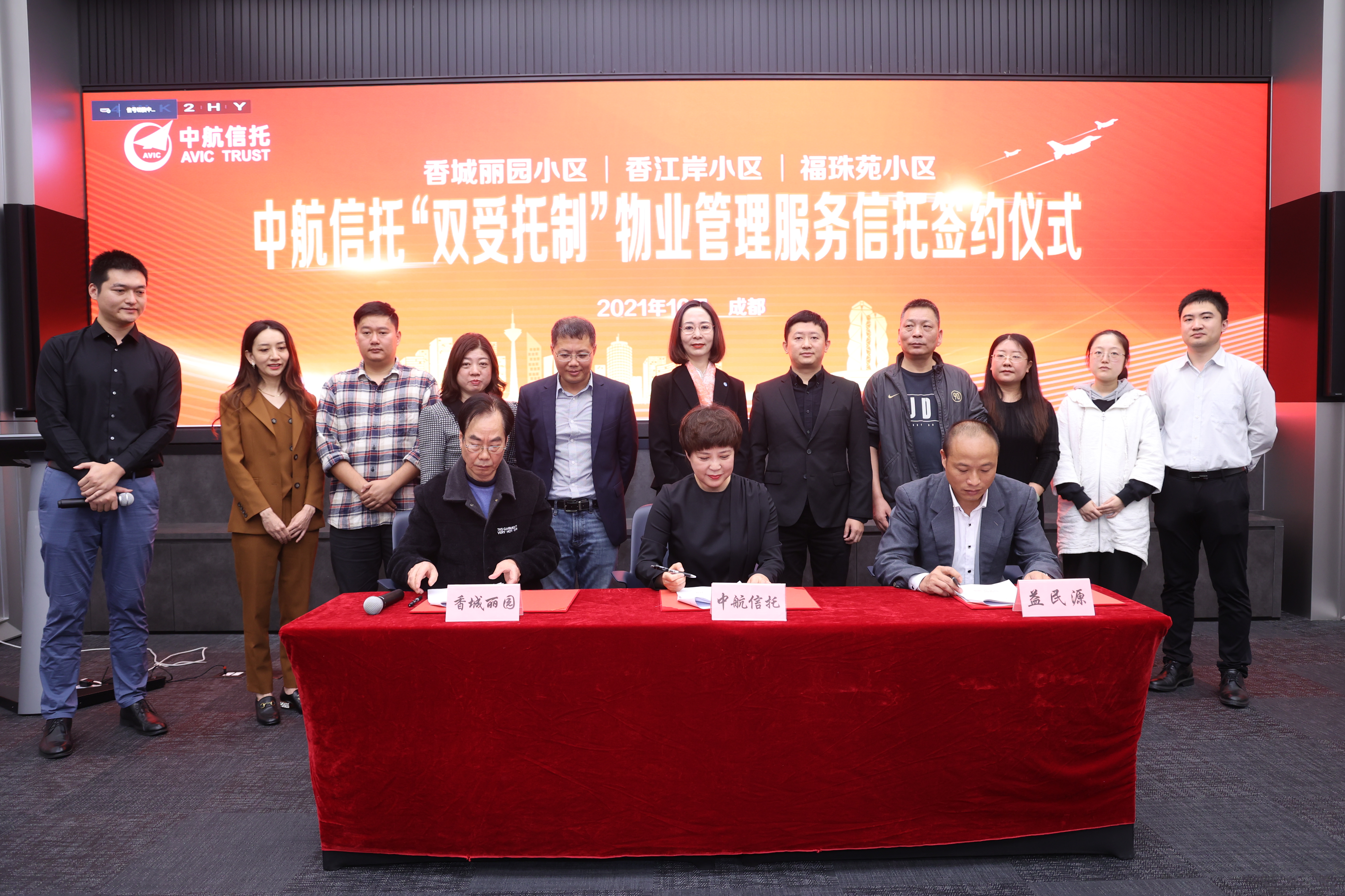 10月13日,中航信托與成都市香城麗園小區(qū)、香江岸小區(qū)、福珠苑小區(qū)業(yè)委會(huì)以及成都益民源、成都誠(chéng)智物業(yè)、成都智樂(lè)物業(yè)簽訂合同,正式落地物業(yè)管理服務(wù)信托。