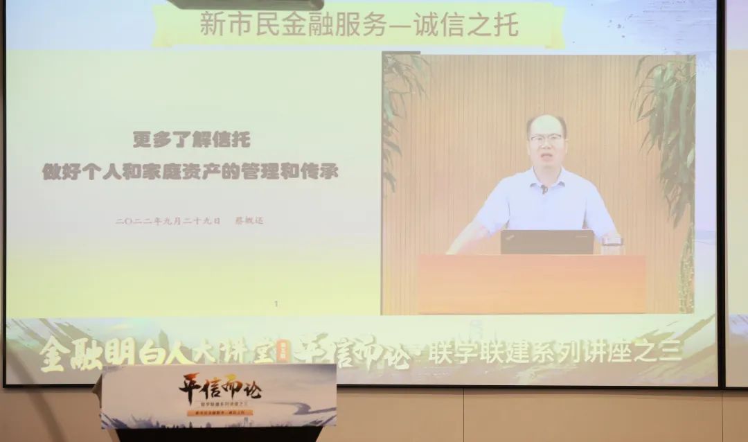 講座邀請(qǐng)到中慈聯(lián)慈善信托委員會(huì)主任、中國信托業(yè)協(xié)會(huì)首席經(jīng)濟(jì)學(xué)家蔡概還作主題報(bào)告分享。報(bào)告中,蔡概還深入淺出地剖析了如何運(yùn)用信托做好個(gè)人和家庭資產(chǎn)的管理和傳承,他通過提出“在資產(chǎn)管理中,財(cái)富由自己打理應(yīng)當(dāng)具備哪些因素?”“未來財(cái)富是自己管理為主還是交由他人管理為主?”“財(cái)富交由他人打理,怎么樣才會(huì)讓人放心,最為重要的關(guān)鍵因素是什么?”等三大問題,層層深入解析,挖掘信托責(zé)任文化特點(diǎn),為與會(huì)各方帶來了一場信托知識(shí)的盛宴。