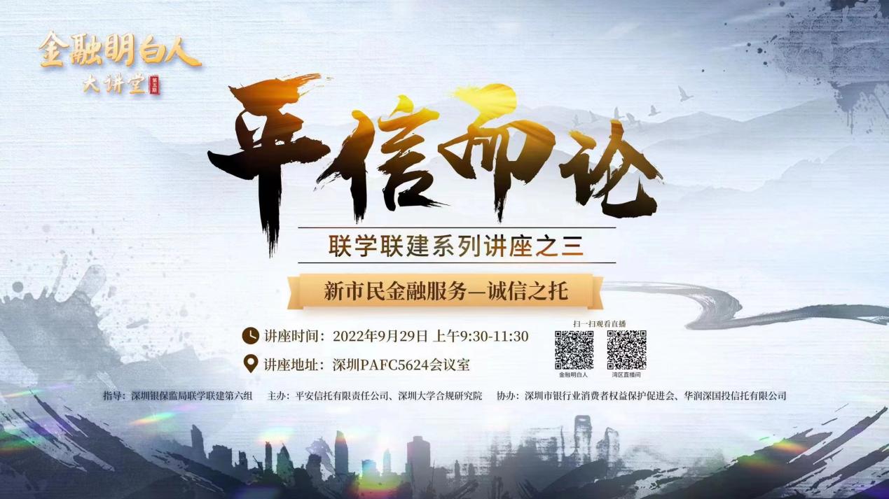 為深入踐行“金融為民、教育為先”的金融教育宣傳理念,向新市民普及信托金融知識(shí),切實(shí)提升新市民的獲得感、幸福感和安全感,9月29日,“平信而論”聯(lián)學(xué)聯(lián)建系列講座第三期暨金融明白人大講堂第五期“新市民金融服務(wù)——誠信之托”在深圳成功舉辦。