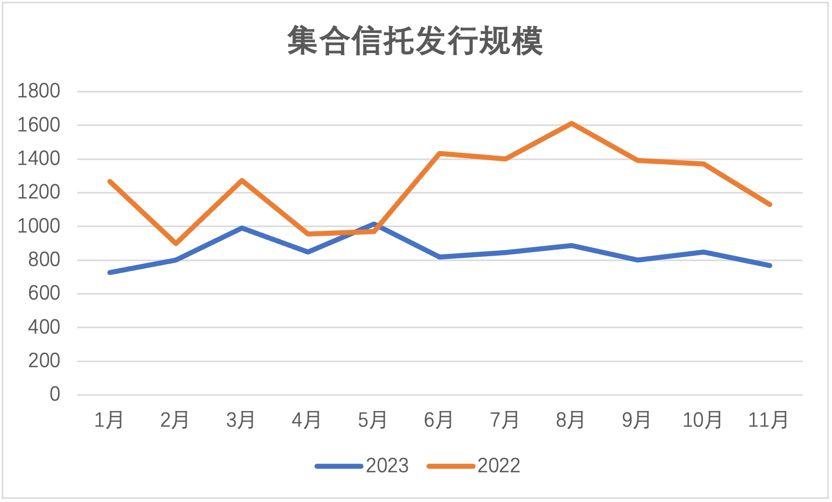 從發(fā)行規(guī)模上看,自2023年5月份達(dá)到1013.2億元的年內(nèi)發(fā)行規(guī)模高點(diǎn)后,此后各月發(fā)行規(guī)模呈現(xiàn)整體波動(dòng)下行趨勢(shì)。11月份,發(fā)行規(guī)模為768.43億元,這也是年內(nèi)第二次單月集合信托發(fā)行規(guī)模低于800億元,創(chuàng)下2023年2月份以來的最低點(diǎn)。另外值得注意的是,今年6月份以來,各月發(fā)行規(guī)模較去年同比均下降超30%。