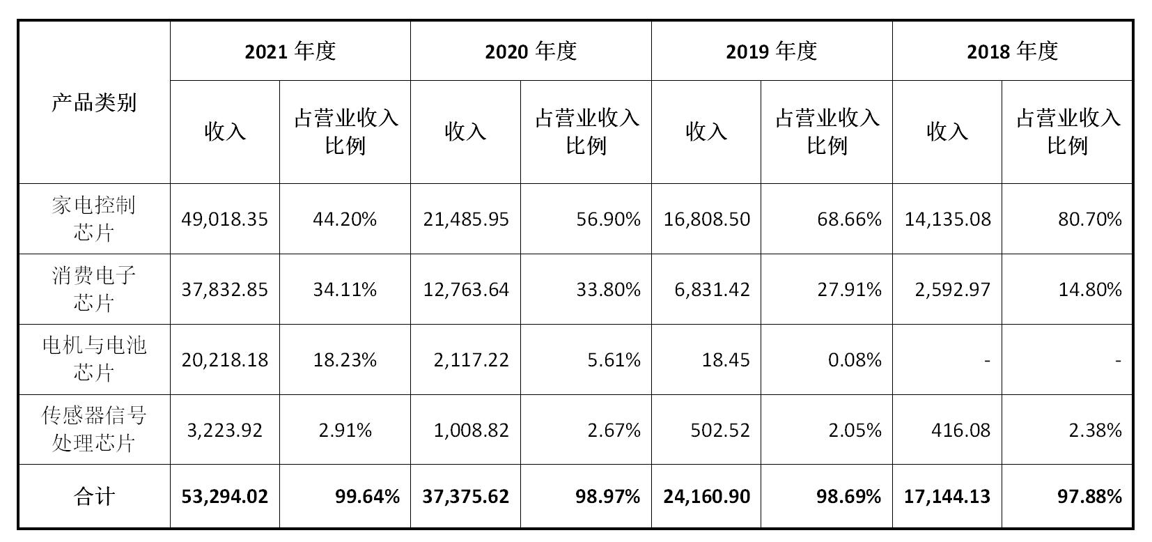 從中微半導(dǎo)的產(chǎn)品構(gòu)成來看,應(yīng)用于熱水器、電磁爐、微波爐等小家電的控制芯片是公司主要營收來源,該部分業(yè)務(wù)收入占比由2018年的80.7%降至2021年的44.2%;應(yīng)用于電動牙刷、電子煙和無線充電器等消費電子的芯片近年來營收占比逐漸提高,由2018年14.8%升至2021年的34.1%;電機與電池芯片從無到有,2021年達到18.2%;傳感器信號處理芯片占比一直在3%以下。