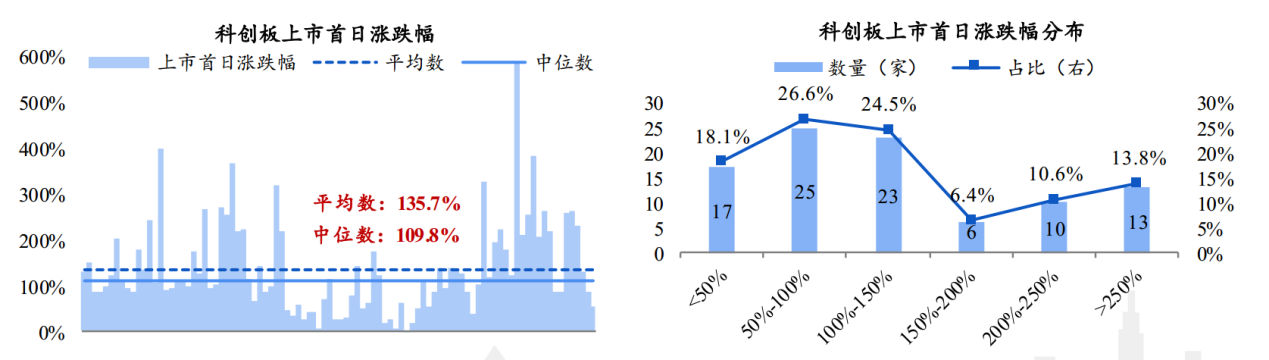 首日漲幅依然可觀,平均達(dá)135%。已上市的96家科創(chuàng)板企業(yè)中,上市首日平均漲跌幅為135%,漲跌幅中位數(shù)為110%,其中,首日漲跌幅最大的為東方生物,漲幅高達(dá)587%;僅有建龍微納這一家公司在上市首日即破發(fā),微跌2%。