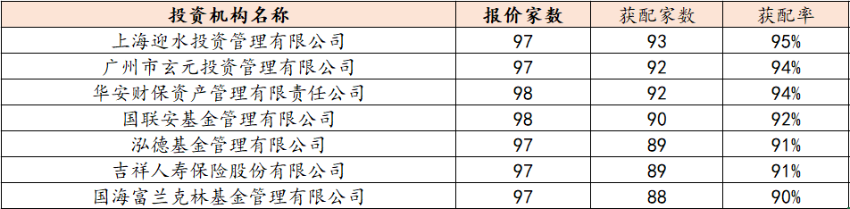 投資機(jī)構(gòu)網(wǎng)下配售獲配率超過(guò)90%的僅7家。相對(duì)比主板/中小板/創(chuàng)業(yè)板,科創(chuàng)板網(wǎng)下詢價(jià)更加市場(chǎng)化,定價(jià)充分體現(xiàn)了不同投資者對(duì)公司價(jià)值的判斷,從而更接近公允價(jià)值。但靈活的詢價(jià)機(jī)制同時(shí)也增加了網(wǎng)下詢價(jià)的報(bào)價(jià)難度,對(duì)網(wǎng)下投資者的專業(yè)能力提出了更高的要求。這7家機(jī)構(gòu)包括2家私募、2家保險(xiǎn)公司、3家公募基金,依次分別為:上海迎水投資管理有限公司(95%)、廣州市玄元投資管理有限公司(94%)、華安財(cái)保資產(chǎn)管理有限責(zé)任公司(94%)、國(guó)聯(lián)安基金管理有限公司(92%)、泓德基金管理有限公司(91%)、吉祥人壽保險(xiǎn)股份有限公司(91%)、國(guó)海富蘭克林基金管理有限公司(90%)。