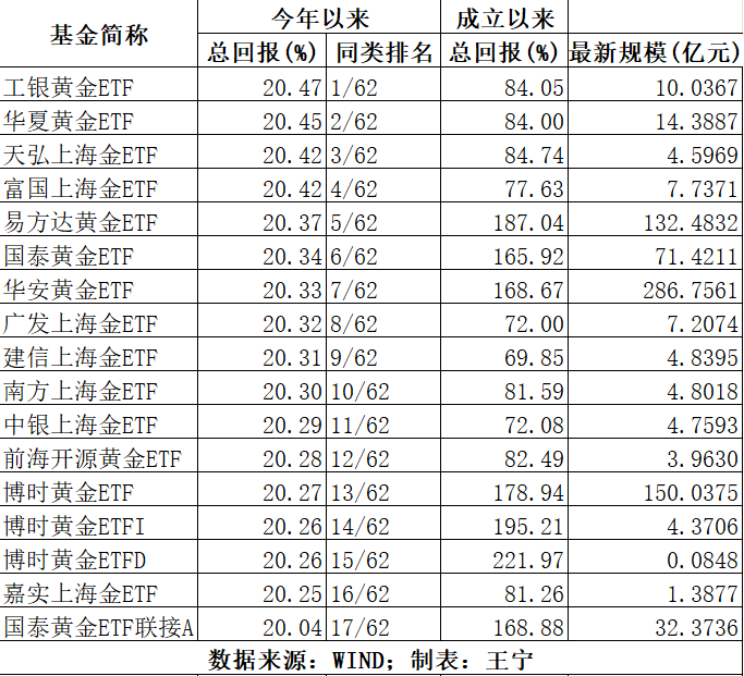 數(shù)據(jù)顯示,62只商品型基金中年內(nèi)業(yè)績(jī)表現(xiàn)較好的均為黃金主題產(chǎn)品,例如華夏黃金ETF、天弘上海金ETF、國(guó)泰黃金ETF、南方上海金ETF和嘉實(shí)上海金ETF等17只產(chǎn)品,收益率均超過(guò)20%;同時(shí),另有35只黃金聯(lián)接基金年內(nèi)收益也都保持在18%—20%之間。此外,多只豆粕和白銀等主題基金也都實(shí)現(xiàn)了正收益。