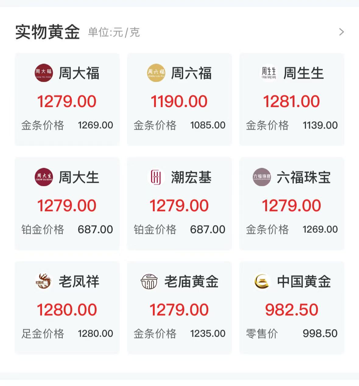 國內(nèi)金飾方面,東方財富數(shù)據(jù)顯示,周生生足金價格已上調(diào)至1281元/克,老廟黃金、周大福、潮宏基、六福珠寶等足金價格上調(diào)至1279元/克。此外,周大福、六福珠寶金條報價達(dá)1269元/克,與金飾足金報價僅差10元,老廟黃金金條價格也達(dá)1235元/克,而周生生等品牌金條報價也在1100元/克左右。