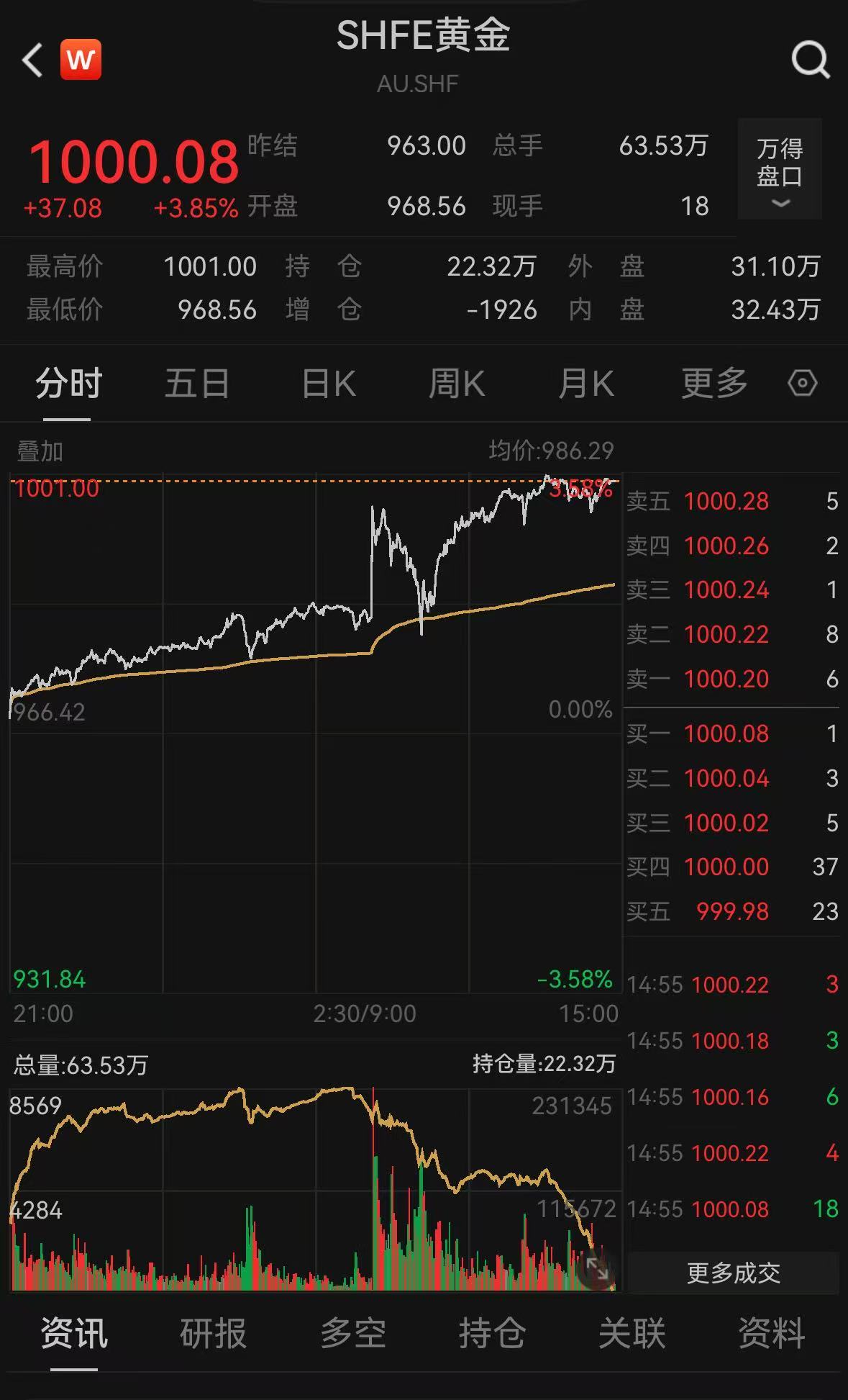 北京時間10月17日午后,SHFE黃金漲幅擴(kuò)大,盤中價格一度突破1000元/克整數(shù)關(guān)口,年內(nèi)漲幅逼近60%,與國際金價漲幅差距縮窄。