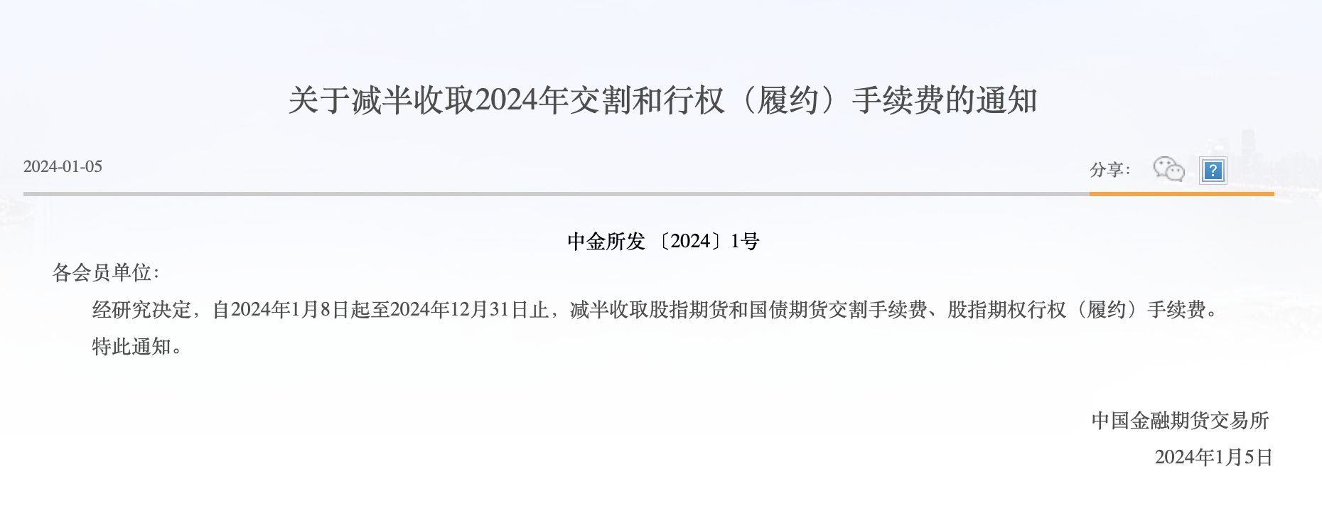 1月5日,中國金融期貨交易所(以下簡稱“中金所”)發(fā)布《關(guān)于減半收取2024年交割和行權(quán)(履約)手續(xù)費(fèi)的通知》。