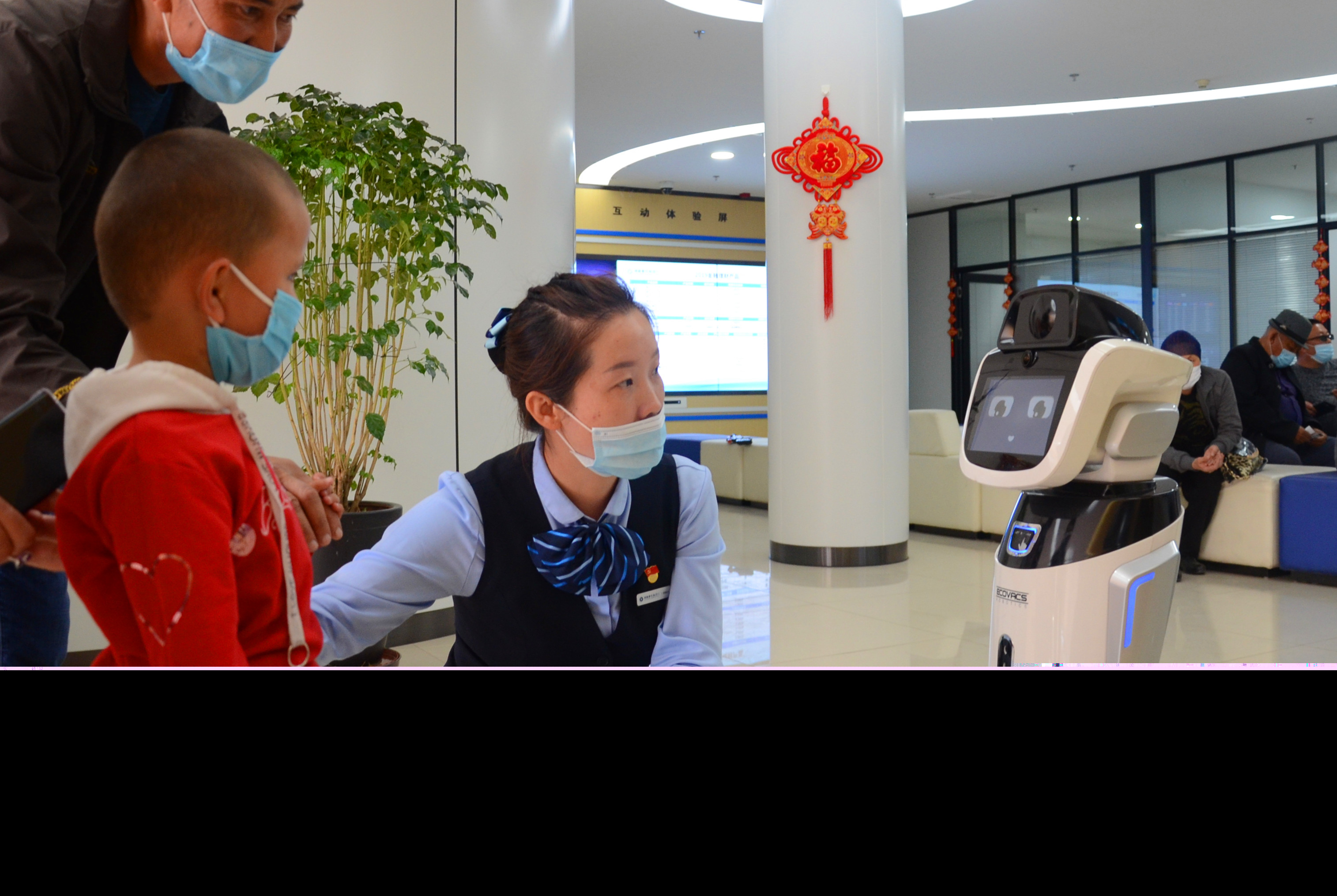 圖為拉扎提小朋友在阿勒泰農(nóng)商銀行金城支行和機(jī)器人“樂(lè)樂(lè)”互動(dòng)