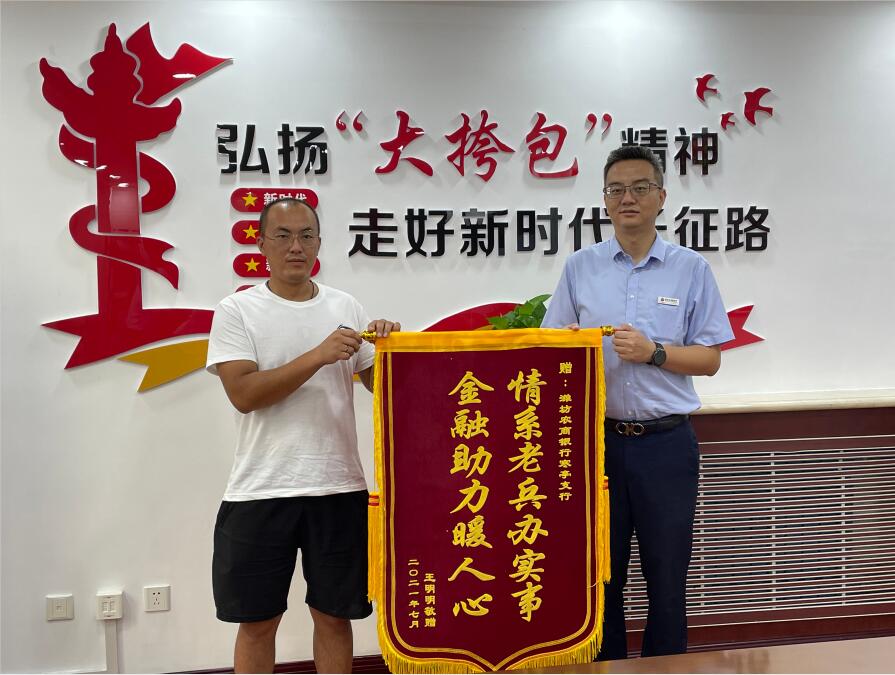 農(nóng)村金融時(shí)報(bào)-農(nóng)金網(wǎng)山東訊(通訊員牟晨冰 王志蕾) “感謝農(nóng)商銀行給咱提供的資金支持,便捷高效,有了農(nóng)商銀行的幫助,再多困難都難不倒咱們退役軍人。”7月28日下午,山東濰坊市寒亭區(qū)退役軍人王明明帶著一面寫有“情系老兵辦實(shí)事、金融助力暖人心”的錦旗走進(jìn)濰坊農(nóng)商銀行民主街支行。