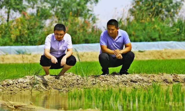 福??h農(nóng)信社客戶經(jīng)理(左)察看水稻長勢。李冉 攝