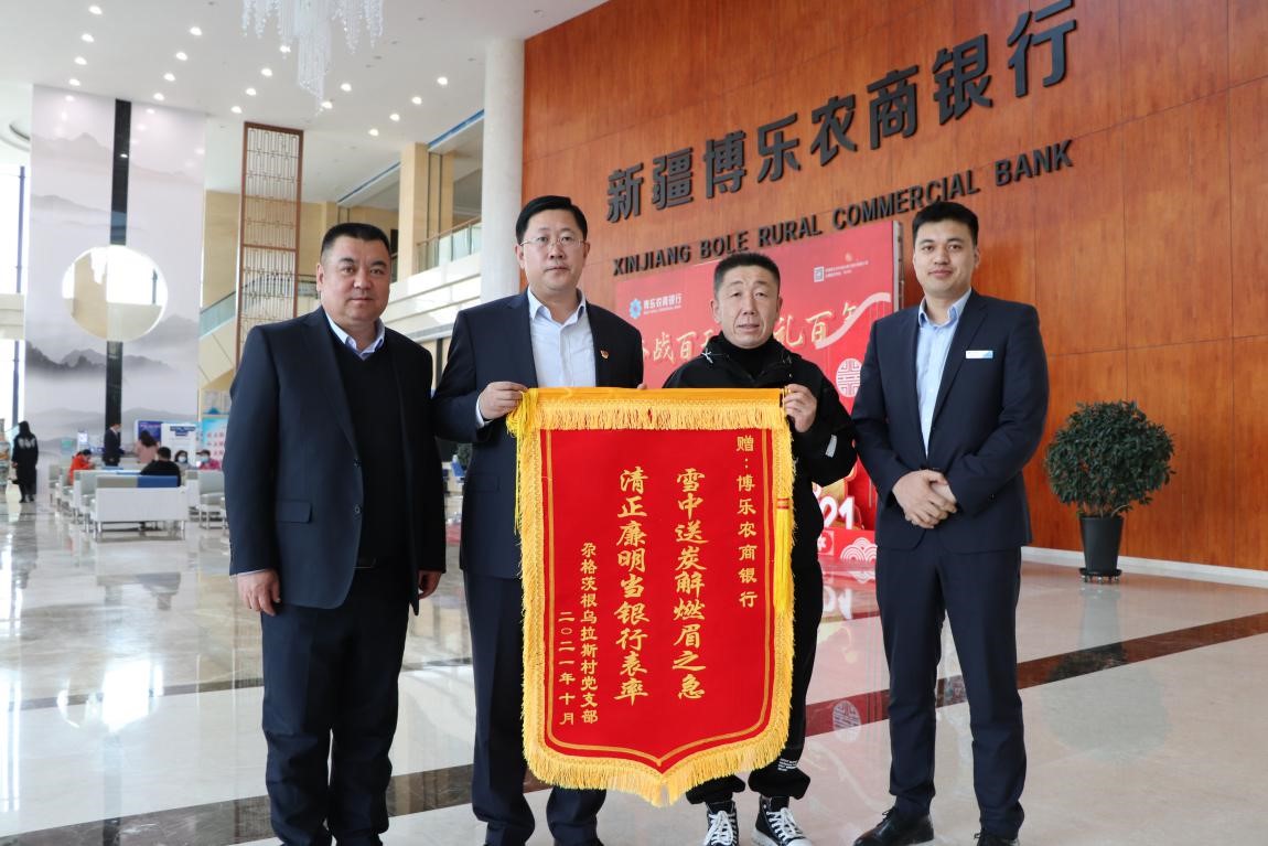 圖為尕格茨根烏拉斯村向博樂農商銀行贈送錦旗 張蕊攝