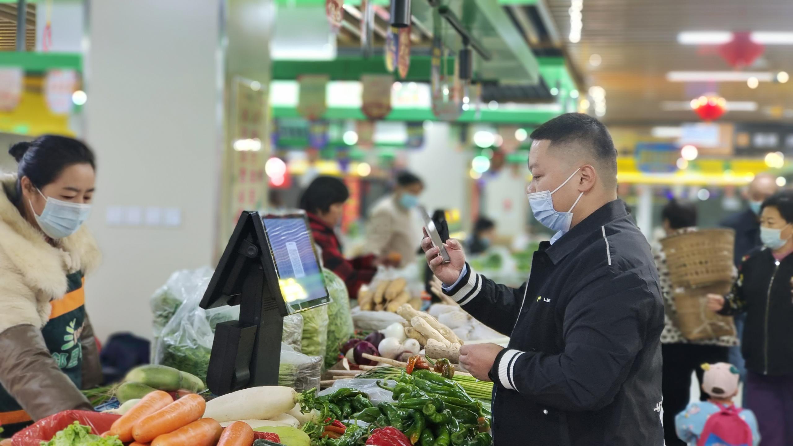 圖為顧客掃描“智能雙屏秤”二維碼付款買菜。 王慶 攝
