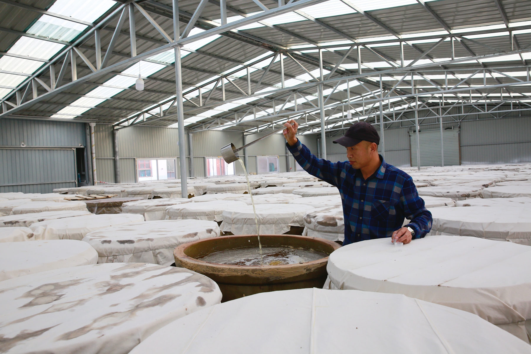 圖為該行信貸支持的加工廠工人正在查看食醋釀酵情況