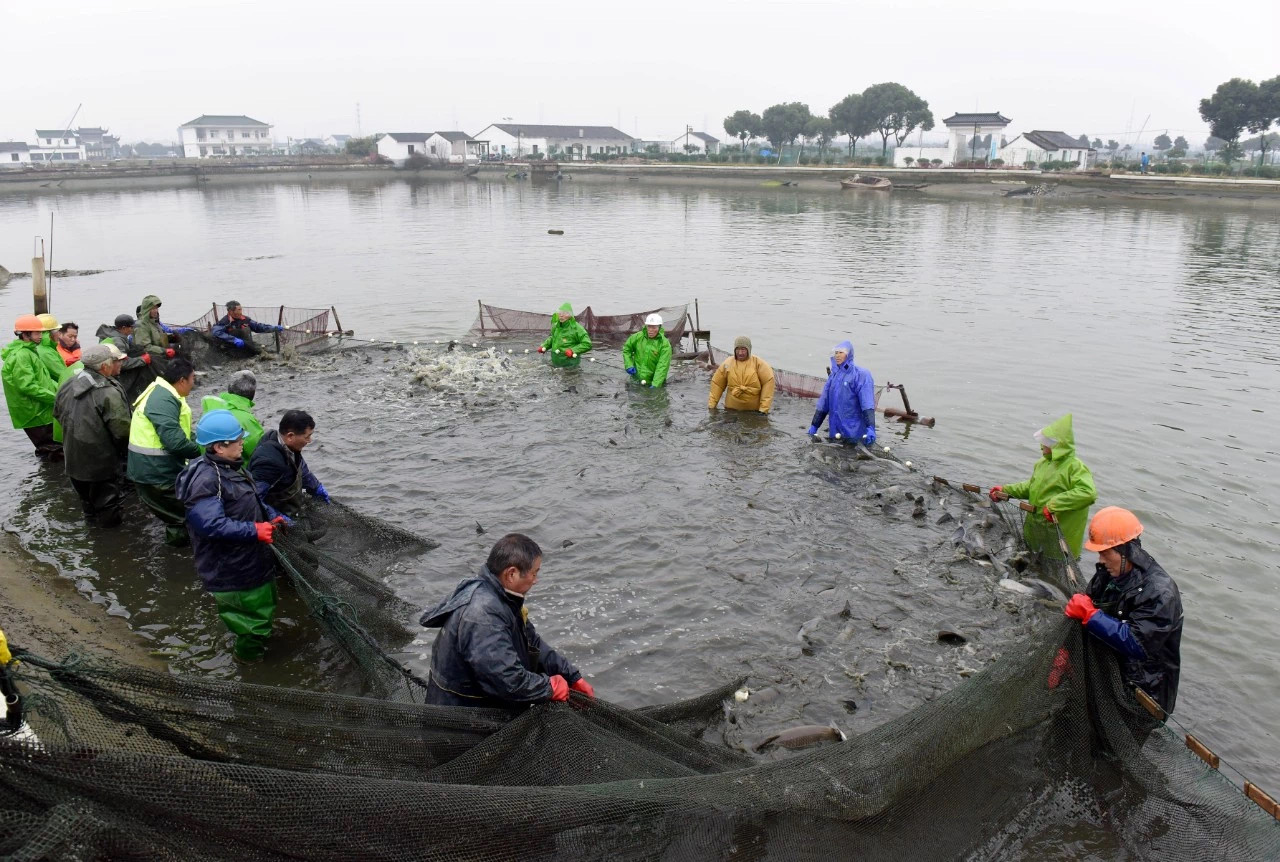 圖為江蘇銀行金融支持甘露青魚產(chǎn)業(yè)迎來大豐收