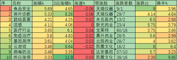 從個股來看,上述三類概念板塊涉及61只個股,其中,10只個股最近4個季度累計凈利潤虧損,動態(tài)市盈率(TTM)無法計算,此外,即使以機構(gòu)普遍看好未來發(fā)展的科創(chuàng)板整體市盈率85.90倍為標(biāo)準(zhǔn),這些概念股中也有22只在此之上,這樣算起來,上述概念股中估值較高股占比已達五成以上。再回過頭來看看周一逆市上漲的醫(yī)療概念股??梢园l(fā)現(xiàn)食品安全、體外診斷、超級真菌等等概念板塊排在板塊監(jiān)測前列,漲幅均超過4%,在滬深兩市大盤均下跌的背景下,一枝獨秀。