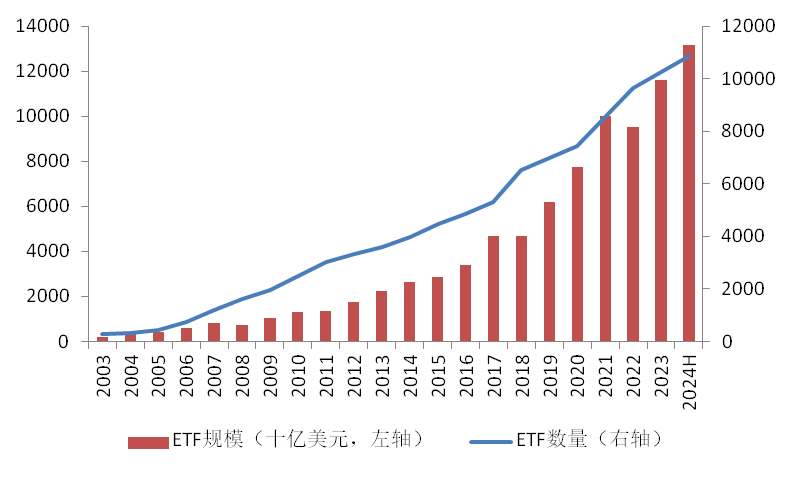 根據(jù)上交所的2024年度ETF行業(yè)發(fā)展報(bào)告,截至2024年6月底,全球掛牌交易的ETF資產(chǎn)總規(guī)模達(dá)到13.17萬億美元,較2023年底增加13.44%。近20年的規(guī)模年均復(fù)合增長(zhǎng)率超20%,產(chǎn)品數(shù)量更是連續(xù)20年保持正增長(zhǎng)。