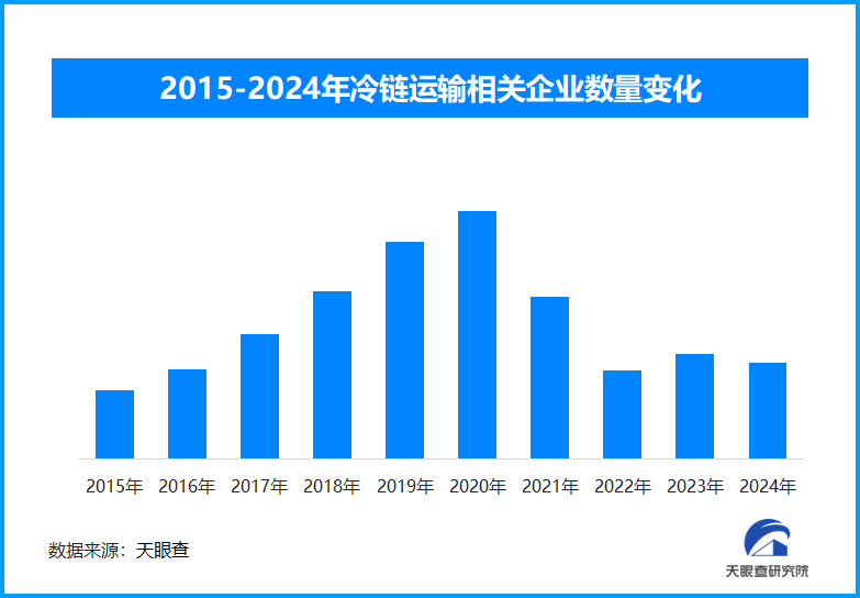 天眼查專業(yè)版數(shù)據(jù)顯示,截至目前,我國現(xiàn)存在業(yè)、存續(xù)狀態(tài)的冷鏈運輸相關企業(yè)超4.7萬家。其中,2024年截至目前新增注冊相關企業(yè)超2700家,從企業(yè)注冊數(shù)量趨勢來看,2020年以前,冷鏈運輸相關企業(yè)的注冊數(shù)量呈現(xiàn)出逐年增長的態(tài)勢,并在2020年達到頂峰,為超7100家。
