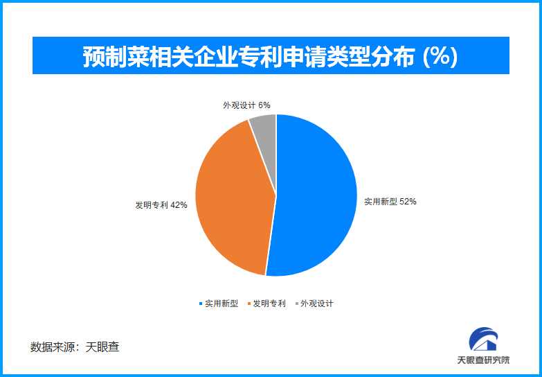 天眼查專業(yè)版數(shù)據(jù)顯示,在預制菜方面的相關專利申請共1225件,其中,實用新型專利和發(fā)明專利占比最高,分別占比52%和42%。這也充分體現(xiàn)預制菜便捷、快速并且擁有技術基因的特點。