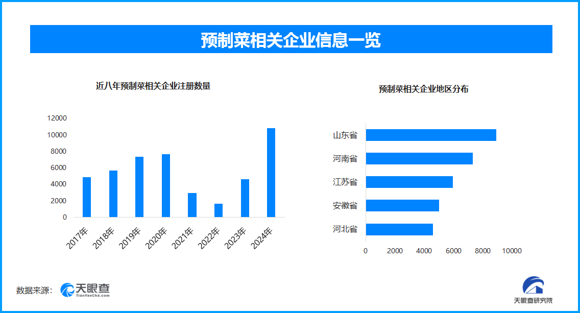 從區(qū)域分布來看,山東省、河南省、江蘇省預制菜相關企業(yè)數(shù)量位居前列,分別為8900余家、7300余家和5900余家。這些地區(qū)農業(yè)資源豐富,食品加工產業(yè)基礎雄厚。例如山東,憑借發(fā)達的農業(yè)產業(yè)鏈,在預制菜生產原料供應和加工技術上優(yōu)勢明顯,當?shù)乇姸囝A制菜企業(yè)產品不僅暢銷國內,還遠銷海外。