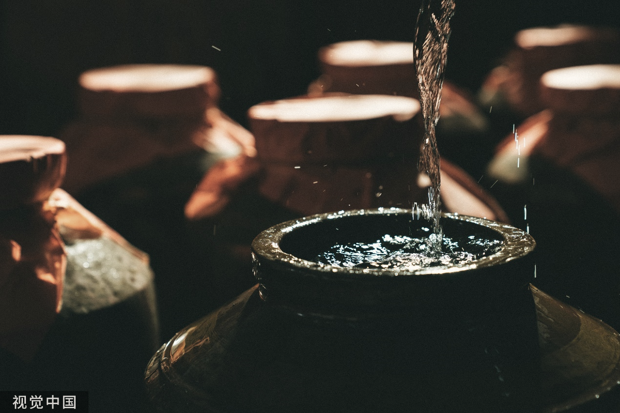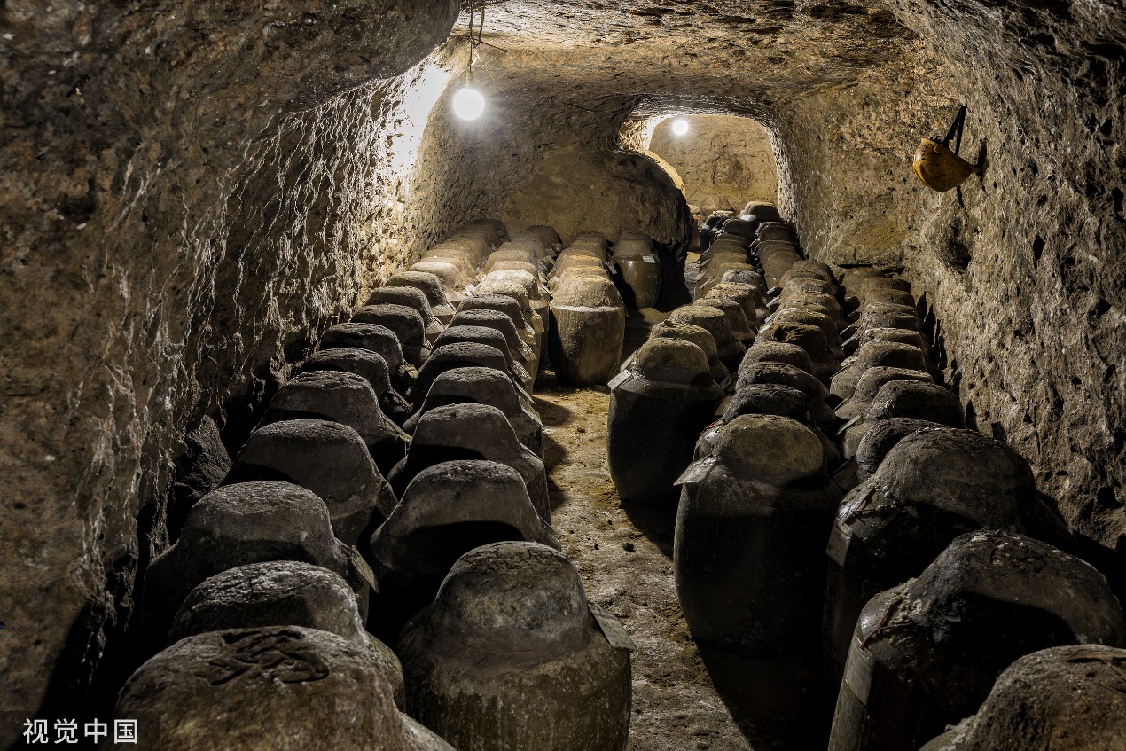 昏黃的光線下,三百口老甕靜臥地窖,酒液在時光中悄然蛻變,壇身酒苔斑駁如詩行。