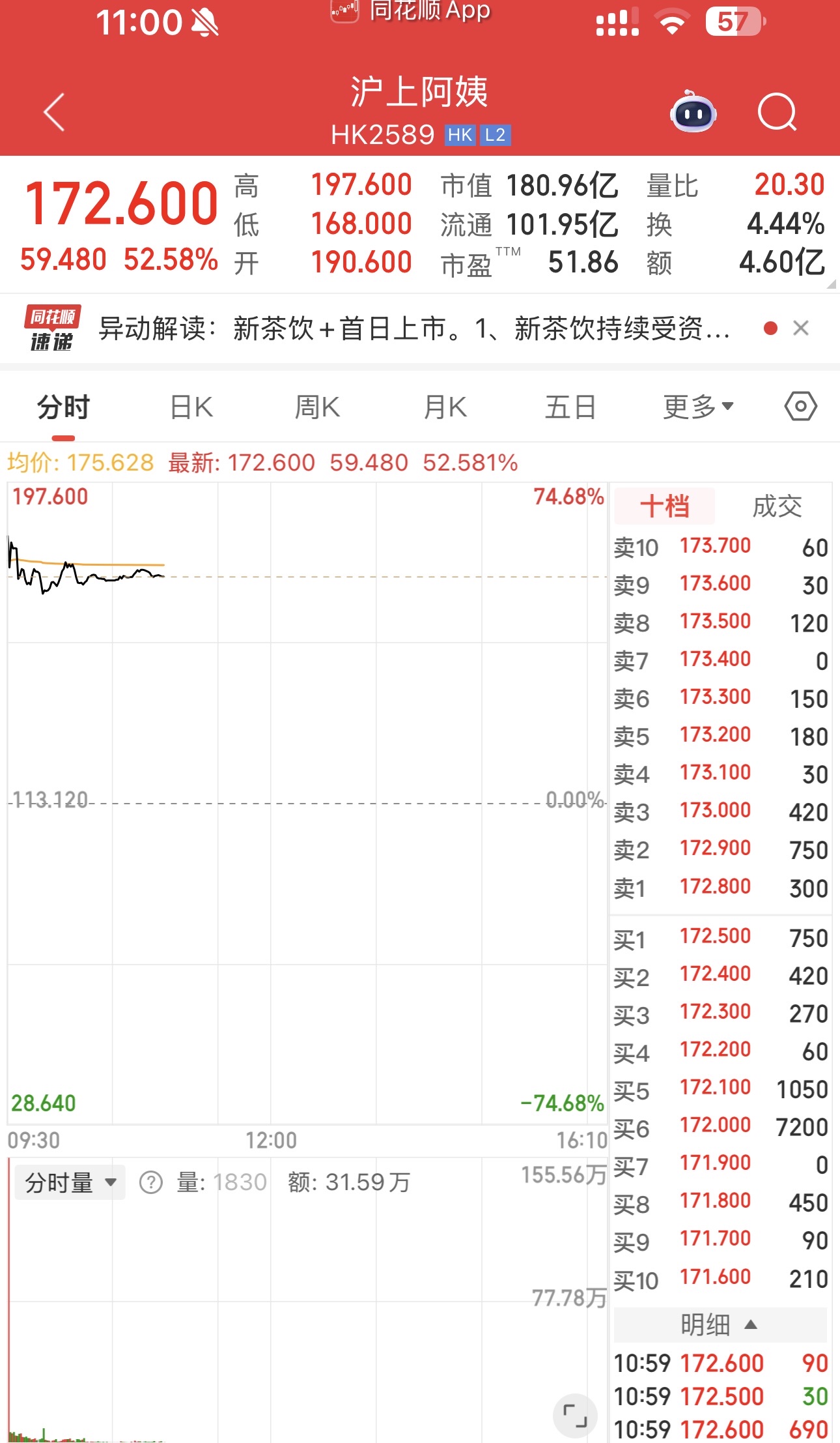 滬上阿姨盤中漲幅最高達(dá)68%,報197.6港元/股,截至上午11點滬上阿姨報于每股172.60港元/股,漲超52.58%,市值180.96億港元。