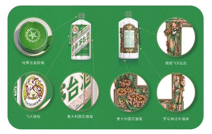 貴州茅臺酒(走進系列·意大利)提取意大利國旗的綠色和國花雛菊的白色匯入產(chǎn)品設(shè)計之中,融合文藝復(fù)興與東方神韻,共譜東西文明交響樂章。
