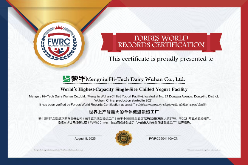 8月8日,以“蒙牛酸奶 世界品質(zhì)”為主題的FWRC福布斯世界紀錄認證新聞發(fā)布會在蒙牛高科乳制品武漢有限責任公司(以下簡稱“蒙牛低溫武漢工廠”)舉行。