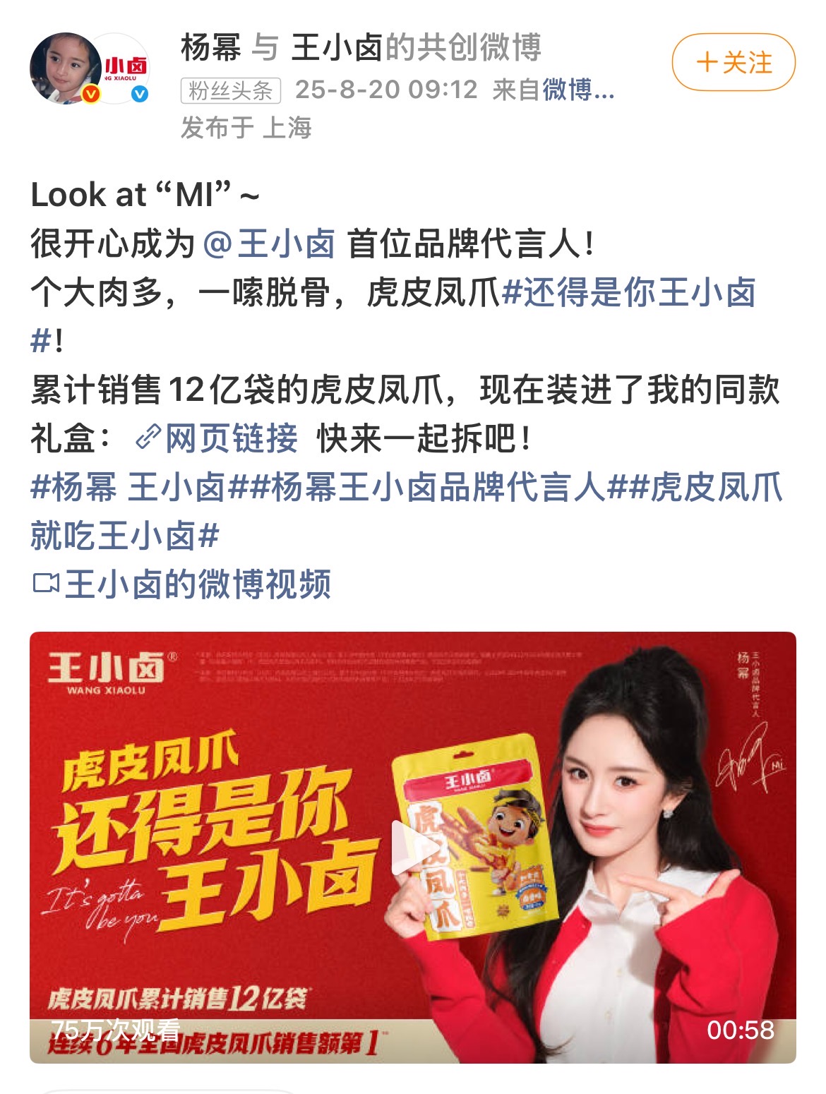 本報(bào)訊 (記者梁傲男)8月20日,北京王小鹵網(wǎng)絡(luò)科技有限公司(以下簡(jiǎn)稱(chēng)“王小鹵”)官宣楊冪為首位品牌代言人。當(dāng)日9時(shí)12分,“楊冪x王小鹵”品牌代言人官宣限定禮盒全網(wǎng)首發(fā)。
