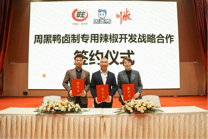 本報(bào)訊 (記者梁傲男)11月19日,周黑鴨國(guó)際控股有限公司(以下簡(jiǎn)稱“周黑鴨”)鹵制專用辣椒開(kāi)發(fā)戰(zhàn)略合作簽約儀式舉行。周黑鴨攜手四川翠宏食品有限公司(以下簡(jiǎn)稱“四川翠宏食品”)、四川省川椒種業(yè)科技有限責(zé)任公司(以下簡(jiǎn)稱“四川川椒種業(yè)”)達(dá)成深度合作,三方以優(yōu)勢(shì)互補(bǔ)為基礎(chǔ)、聯(lián)合創(chuàng)新為核心,共同開(kāi)發(fā)適合鹵味產(chǎn)業(yè)應(yīng)用的辣椒新品種,這既是周黑鴨首次布局上游香辛料定制開(kāi)發(fā),更是鹵味行業(yè)中首家達(dá)成香辛料定向開(kāi)發(fā)的突破性舉措。