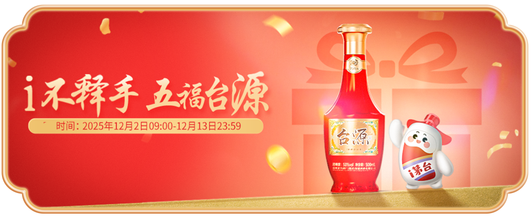 12月2日09:00-12月13日23:59,開啟“i不釋手 五福臺(tái)源”活動(dòng)。每購買2瓶53%vol500ml臺(tái)源(紅),贈(zèng)臺(tái)源酒具1套,購1-5瓶還可參與抽米家充氣寶。每購買1箱(6瓶)53%vol500ml臺(tái)源(紅),贈(zèng)保健酒業(yè)定制背包1個(gè),再抽科沃斯掃地機(jī)器人X9(水箱版)、HUAWEl FreeBuds pro 4悅彰耳機(jī)、米家Mini洗衣機(jī)1kg。多買多贈(zèng),嗨購不打烊。