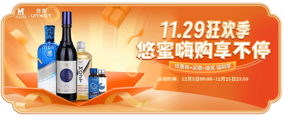 12月3日09:00-12月25日23:59,開啟“11·29狂歡季 悠蜜嗨購享不停”活動(dòng)。上i茅臺(tái)App買悠蜜產(chǎn)品,為甜蜜加碼:①領(lǐng)券立減:10000張滿減券大放送,可用于購買悠蜜藍(lán)莓精釀?dòng)鲆?middot;藍(lán)雪、UMEET靛嵐藍(lán)莓蒸餾酒40%vol等產(chǎn)品。②多買多贈(zèng):莫其托貴州味道系列雞尾酒藍(lán)莓酸“買一贈(zèng)一”、umeet二倍濃縮藍(lán)莓汁(復(fù)原)“買五贈(zèng)三”。③幸運(yùn)抽獎(jiǎng):購買任意悠蜜活動(dòng)產(chǎn)品,抽500/200/100元抵扣券。有i有禮,甜甜蜜蜜。