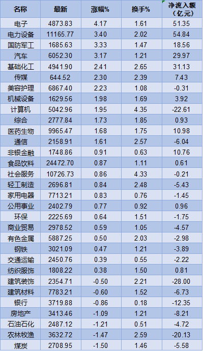 從申萬一級(jí)行業(yè)來看,有24類行業(yè)上漲,電子居首,漲幅達(dá)4.17%,電力設(shè)備、國防軍工、汽車等行業(yè)漲幅均超3%;此外,有7類行業(yè)下跌,煤炭跌幅居首,達(dá)1.50%,農(nóng)林牧漁、石油石化、房地產(chǎn)等跌幅也超過1%。