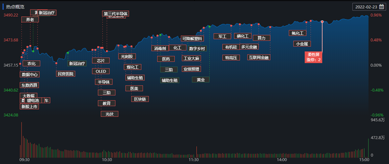 盤面來看,截至2月23日收盤,上證指數(shù)漲0.93%,深證成指漲1.9%,創(chuàng)業(yè)板指漲2.82%;滬深兩市合計(jì)成交額10409億元,突破一萬億元;總體來看,兩市個(gè)股普漲,有3608只個(gè)股上漲,其中有104只個(gè)股漲停報(bào)收。